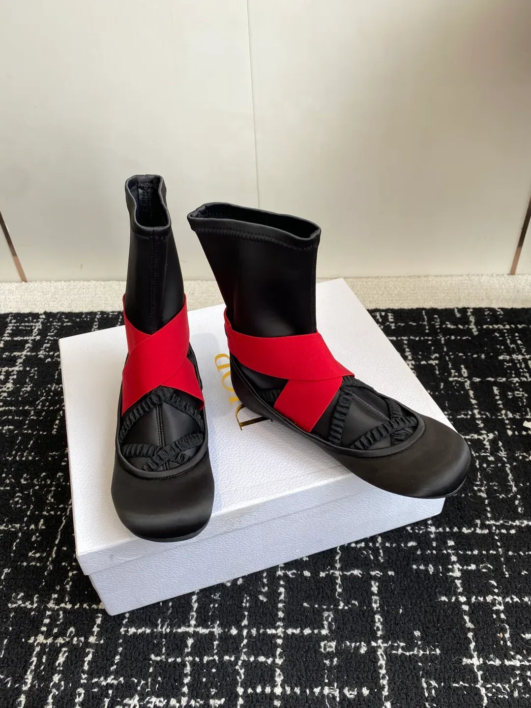 Ботинки CHRISTIAN DIOR балетного стиля с эластичной верхней частью. Черно-красная палитра создает эффектное сочетание. Верх выполнен из импортированной овечьей кожи с элементами итальянского шелка, что придает благородную фактуру и роскошный внешний вид. Подкладка из овчины обеспечивает мягкость, а подошва из TPU отличается прочностью и гибкостью.