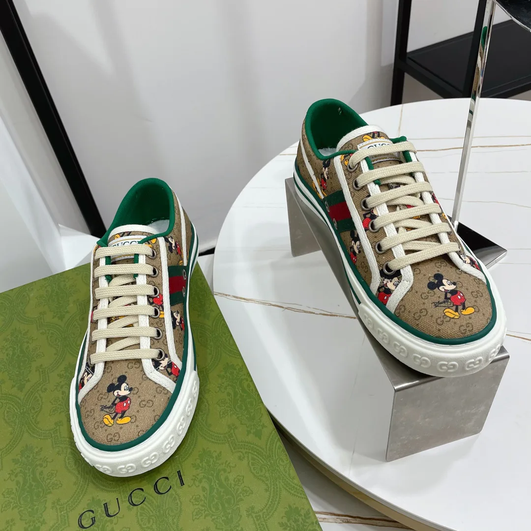 Кеды женские GUCCI — пара кроссовок из классической серии Tennis 1977, обновленная версия, популярная в 2021 году. Материалы: машинная вышивка, ткань с 5D‑печатью, стирёная джинсовая ткань и дышащая сетка. Внутренняя часть — махровая ткань; средний слой — PU‑кожа; поверхности внутри и снаружи не мнутся. Подошва — оригинальная, с полной шовной обработкой и литьевой основой. Технология: полная облицовка колодки и пустотелая подошва. Размеры: женские 35–40, мужские 39–44.