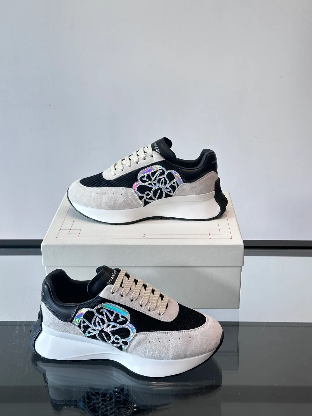 Кроссовки женские ALEXANDER MCQUEEN — Sprint Runner выполнены с контрастным дизайном и акцентом на сочетании материалов. Верх сочетает ткань, замшу и сетку, обеспечивая вентиляцию и текстуру. На боковине размещена вышивка красной розы, создавая британский акцент. Утолщенная подошва обеспечивает комфорт и визуально приподнимает силуэт. Подойдут для повседневной носки и спортивных занятий.