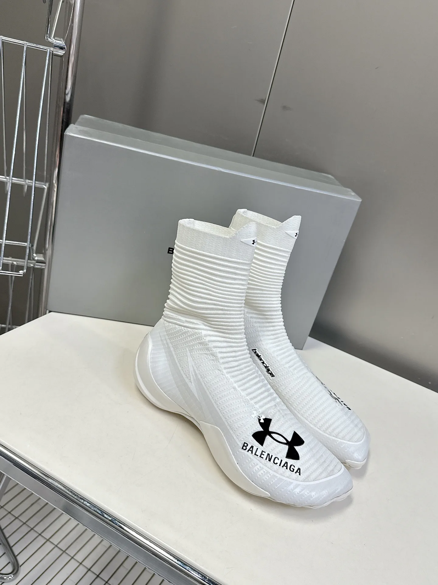 Обувь выполнена в минималистичном стиле и украшена двойным логотипом двух брендов. Носки-обувь изготовлены из оригинального летнего текстиля с применением технологии Flyknit, имеют каплевидную обработку. Уникальная подошва из резины и PU обеспечивает хорошее сцепление и комфорт.
