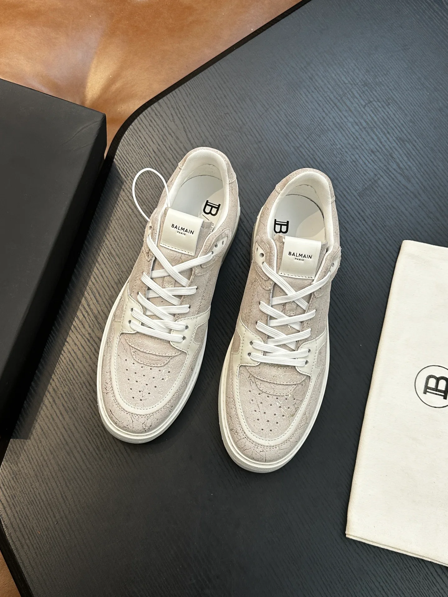 Кроссовки имеют язычок с кожаной вставкой и логотипом BALMAIN. Задние и боковые детали оформлены в аккуратной форме, добавляя глубину. Подошва из TPU украшена логотипом бренда в соответствующей цветовой гамме. Стандартно доступны размеры 39-44, а также по заказу 38, 45, 46 и 47.