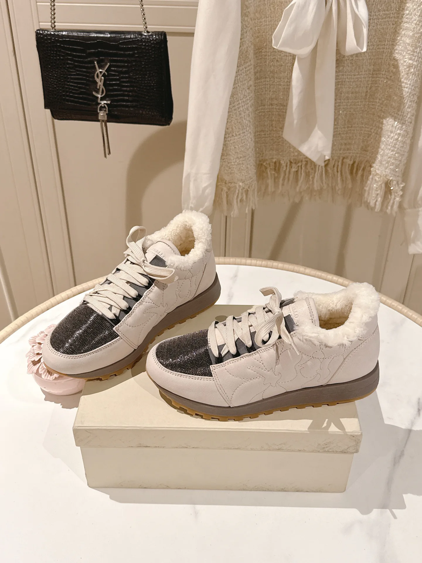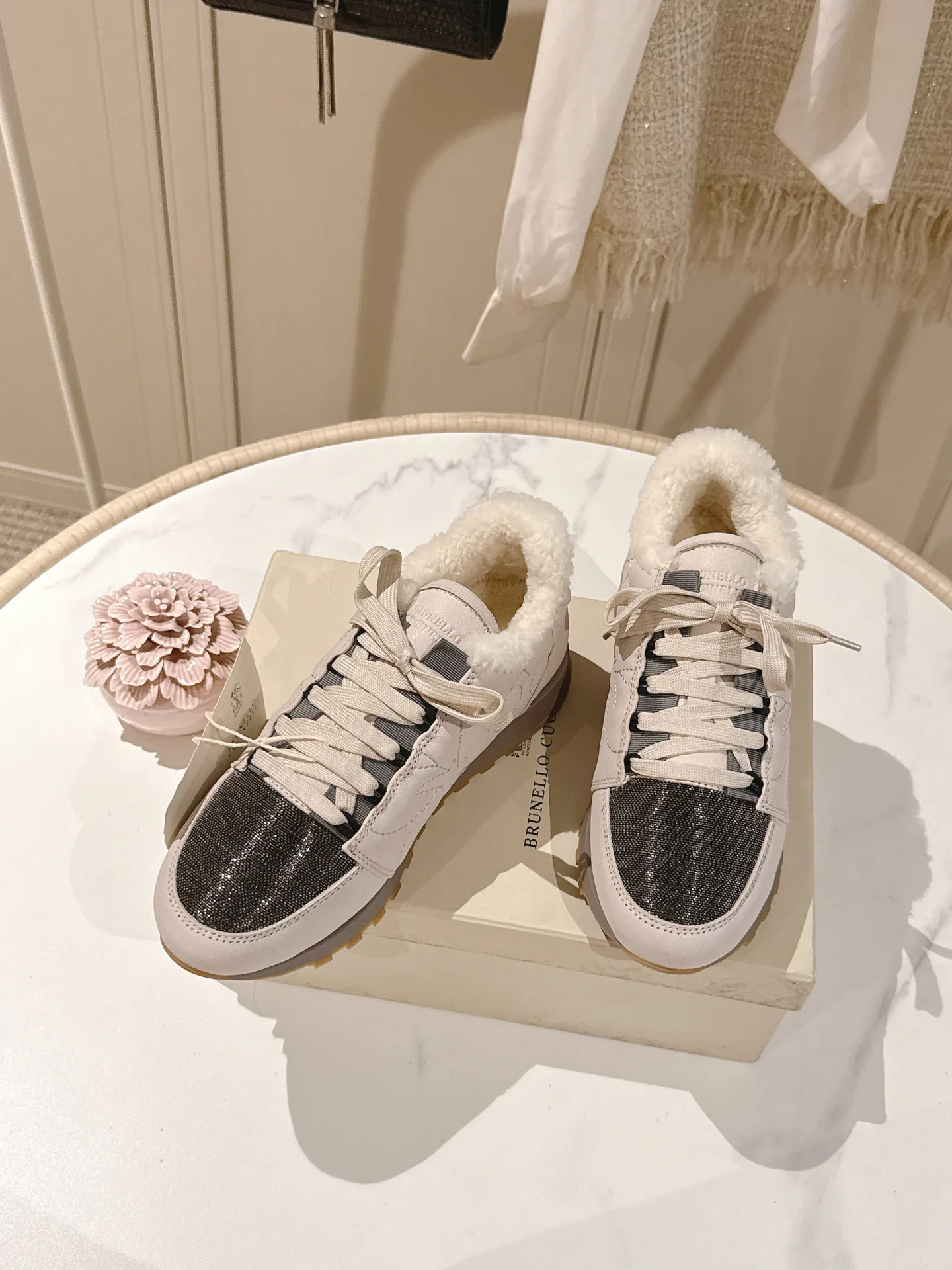 Внутренняя подкладка из теплой шерсти обеспечивает комфорт и тепло. Подошва изготовлена из нескользящей резины с толщиной около 3 см. Кроссовки подходят для осенне-зимнего сезона и идеально сочетают спортивный стиль с элегантностью. Размерный ряд представлен от 35 до 42.
