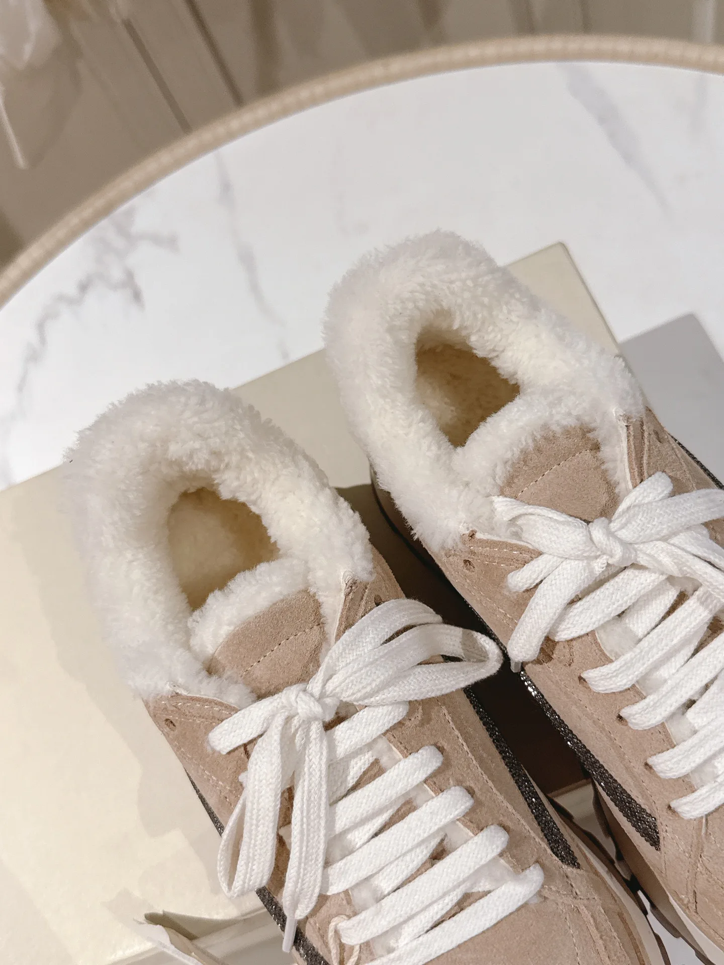 Передняя часть обуви украшена жаккардовой трикотажной фактурой с градиентным эффектом и ламе-нитьями. Вставки из мягкой замши по бокам создают элегантный контраст. Глазки для шнурков дополнены вышивкой бусинами, что подчеркивает женственность изделия. Эти кроссовки прекрасно подходят для повседневной носки и могут сочетаться с casual- и умной повседневной одеждой.