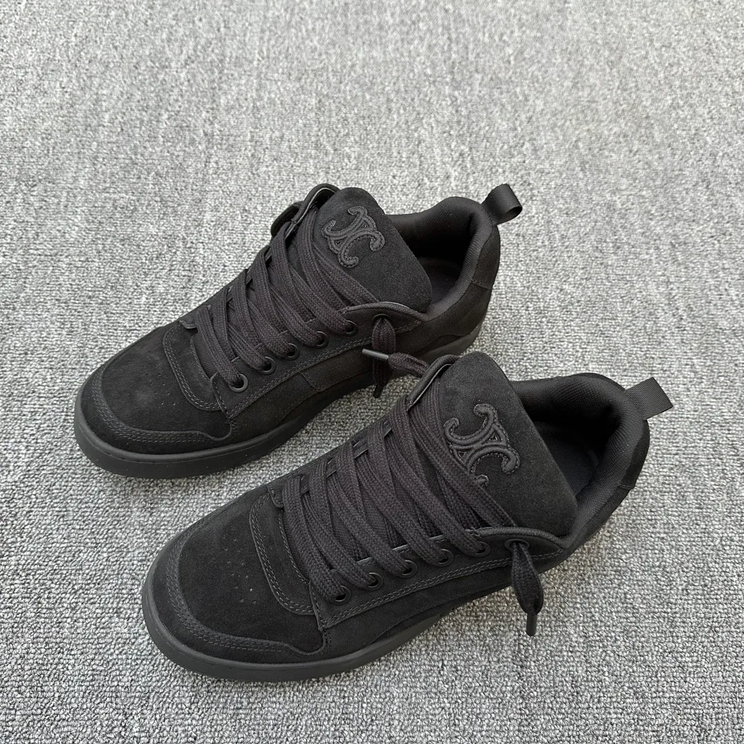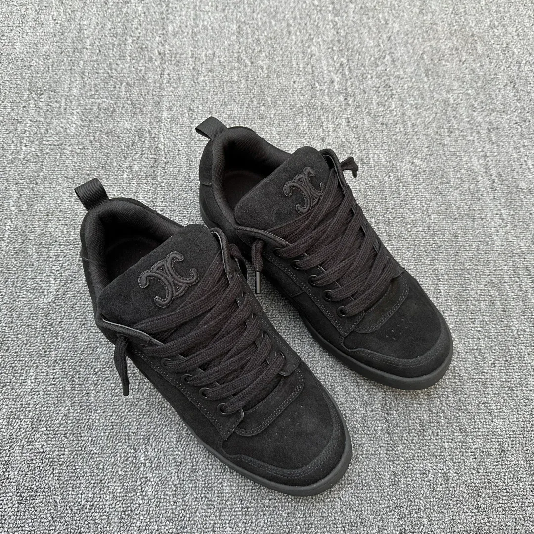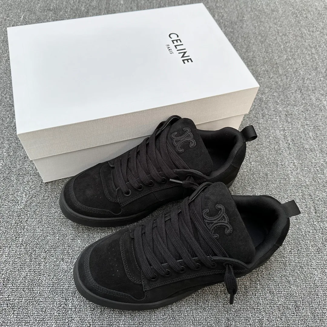 Детали включают вышивку TRIOMPHE на язычке и внутреннюю эластичную ленту для поддержки. Боковая часть подошвы украшена тиснением логотипа, на нижней стороне — рельефное обозначение CELIN. Комфорт достигается за счёт тканевой стельки и резиновой подошвы.
