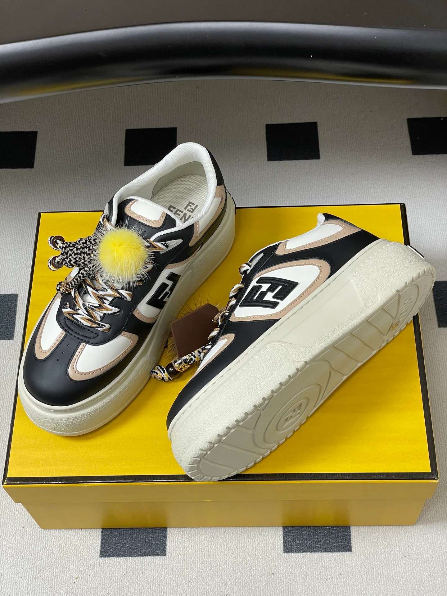 Кроссовки женские FENDI — серия Match с светло-розовой кожаной поверхностью и бело-охристо-коричневыми деталями. На боковине расположена цветная кожаная нашивка с эмблемой FF, шнурки белого, розового и охристо-коричневого цветов. Задник украшен крупной тиснённой надписью фирменного знака. На язычке — металлическое кольцо-подвеска. Правая модель имеет подвеску с деталями меха sable и золотой цепочкой FF, левая — шнурок с помпоном из меха sable и элементами Pequin. Верх — импортированная кожа первого слоя, внутренняя подкладка — дышащая сетчатая, подошва по оригинальной форме — ультра-легкий вспененный материал, толщина около 5 см, размеры женские 35–40, 40-й размер изготовлен под заказ и не подлежит возврату.