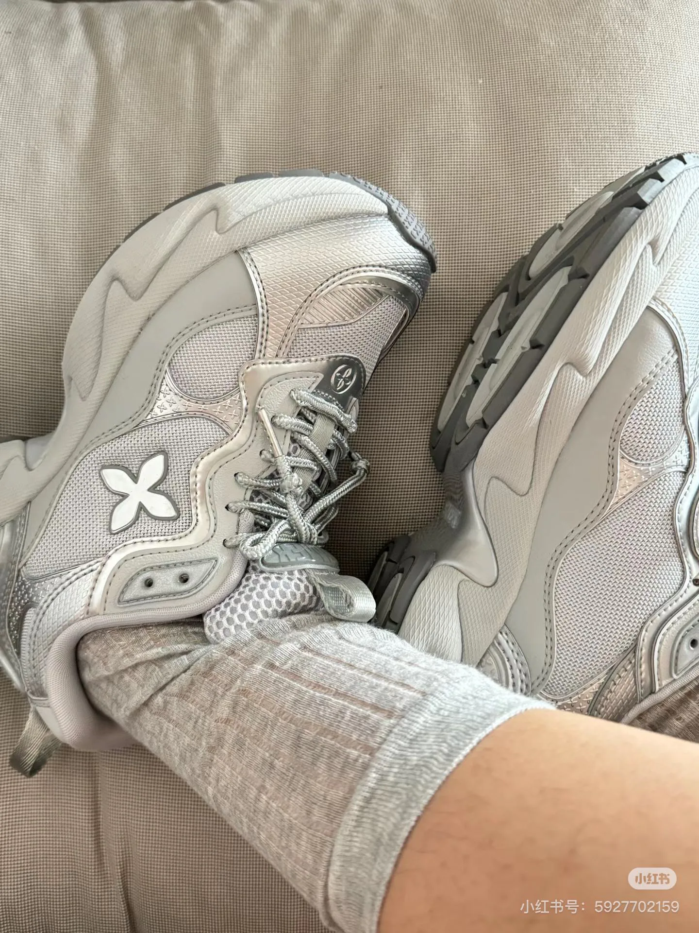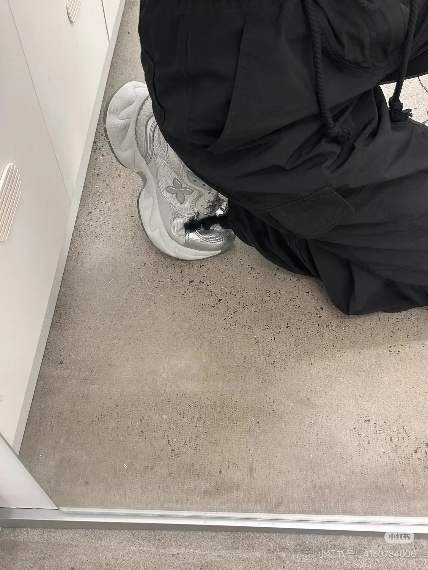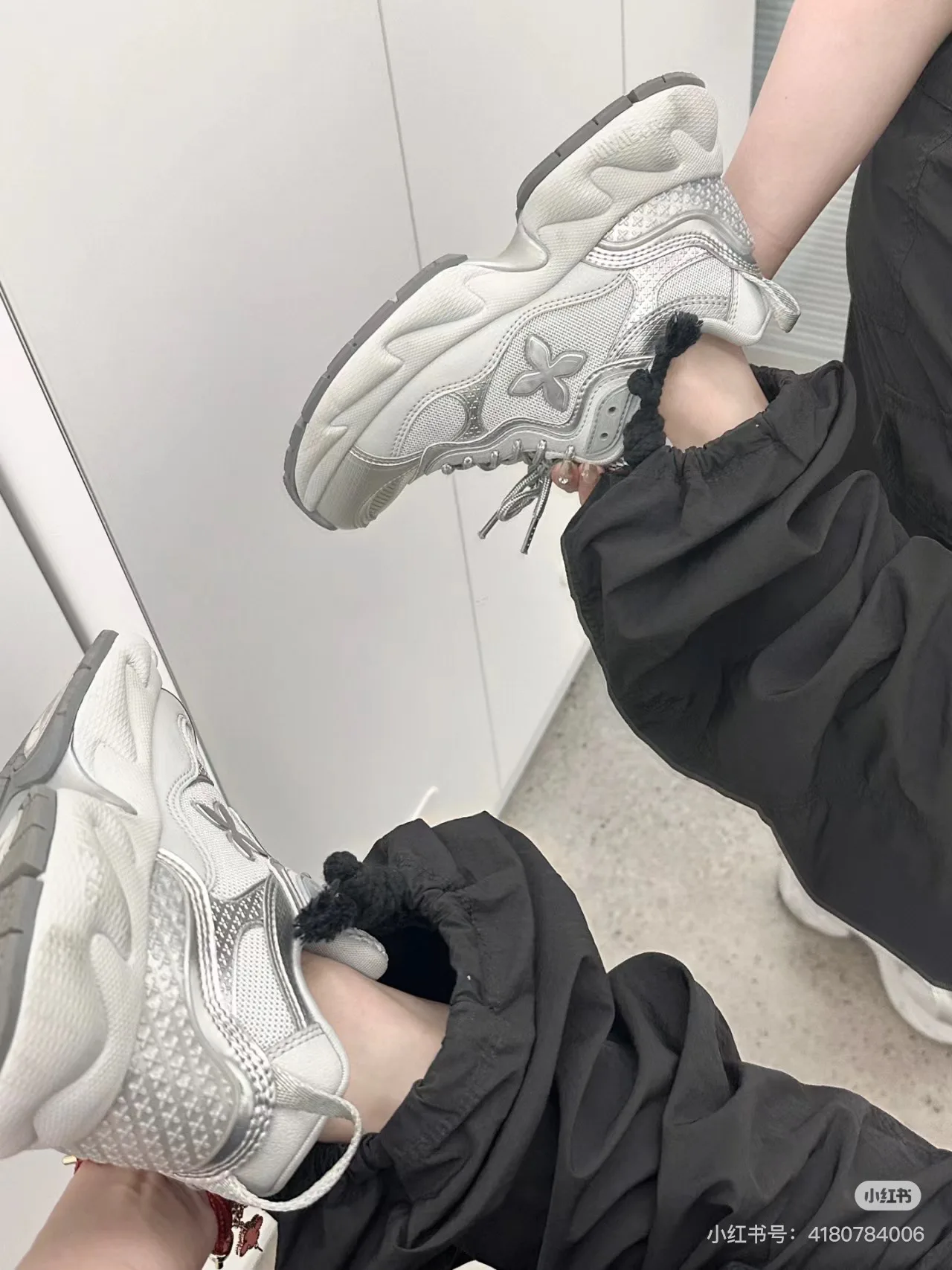Верх выполнен из синтетических и текстильных материалов; обувь подходит мужчинам и женщинам. Блестящее текстурированное покрытие и логотип в виде цветка на боковой стороне дополняют образ. Подошва серого цвета с рифленым протектором обеспечивает устойчивость на разных поверхностях, снижая риск поскользнуться.