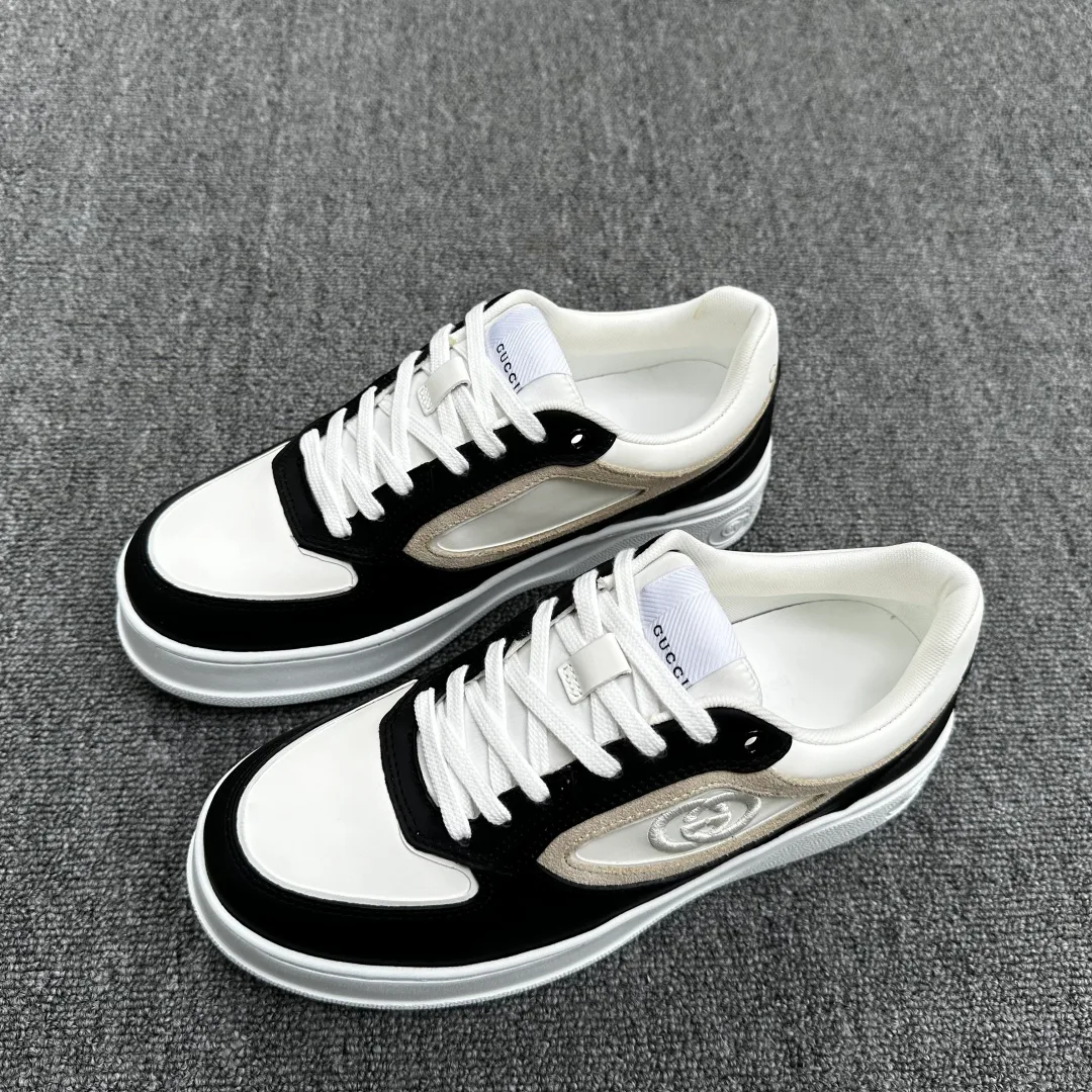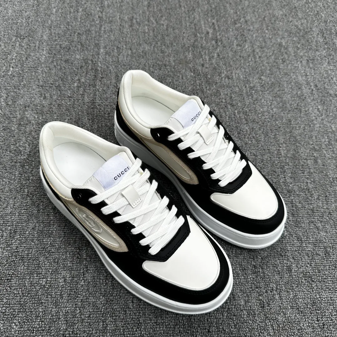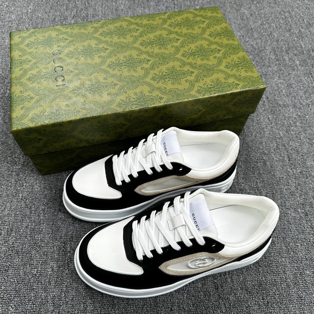 Верх — гладкая кожа телёнка высокого качества; боковые панели украшены принтом Gucci-тесьмы; задник дополнен фирменной нашивкой с двойной буквой G.