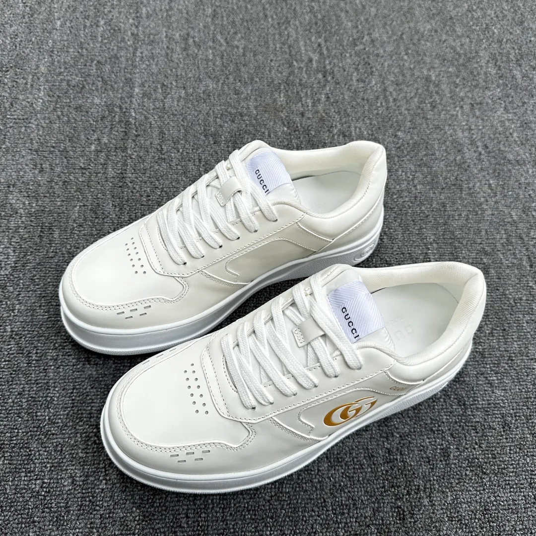 Задник украшен принтом двойной буквы G, дополняющим узнаваемый стиль. Подошва — резиновая, с классическим логотипом Gucci, создавая образ в ретро-стиле.