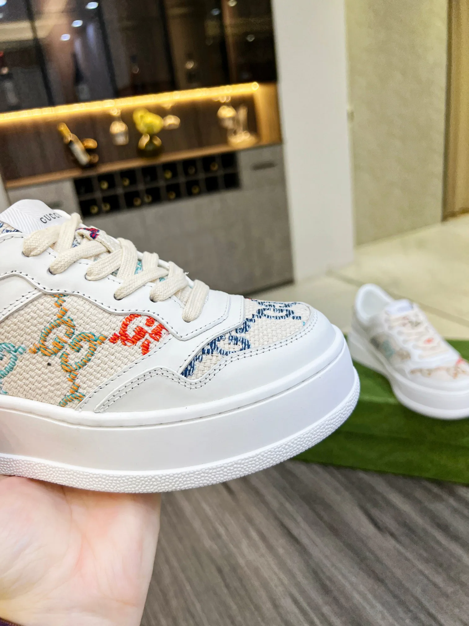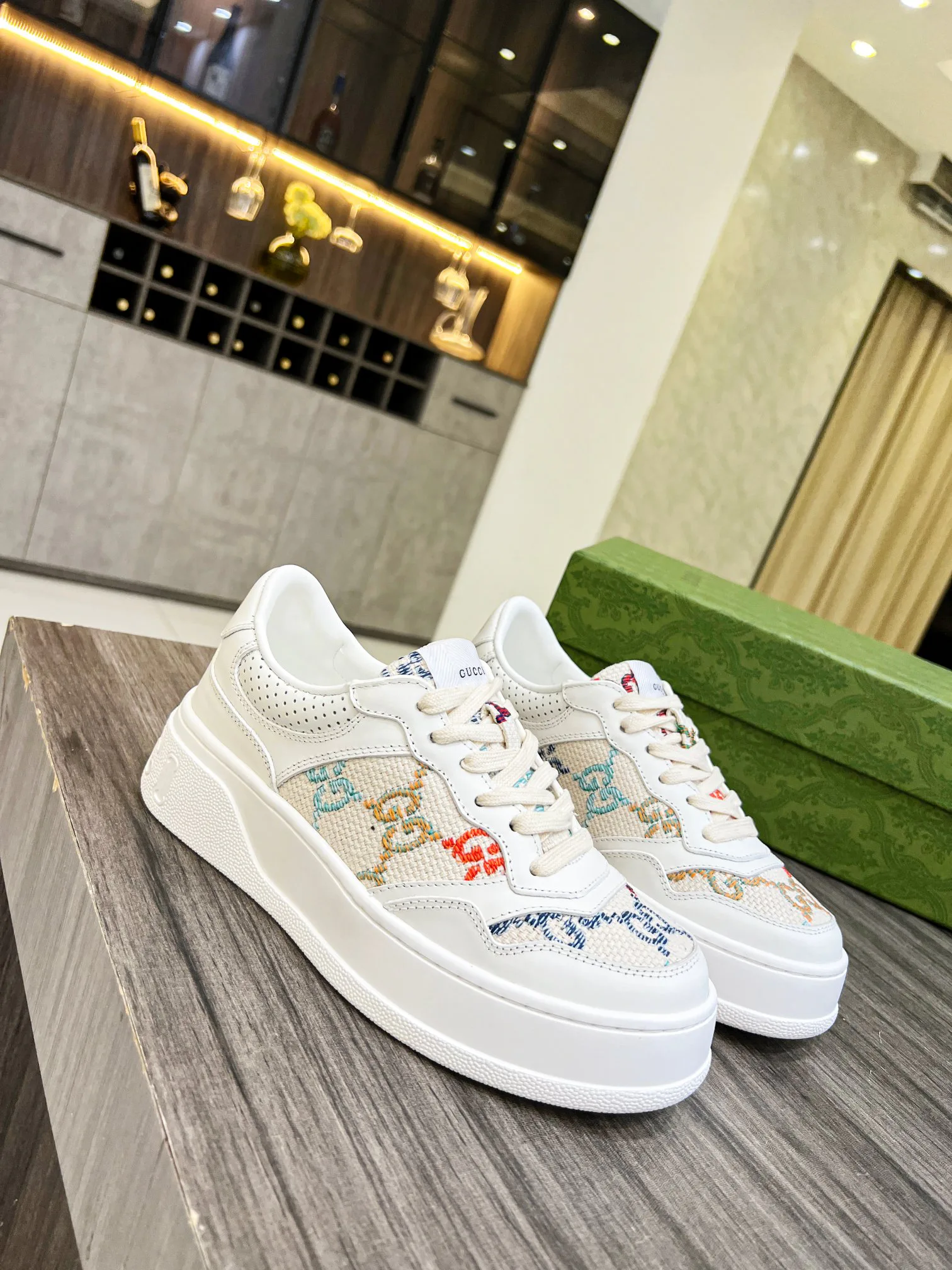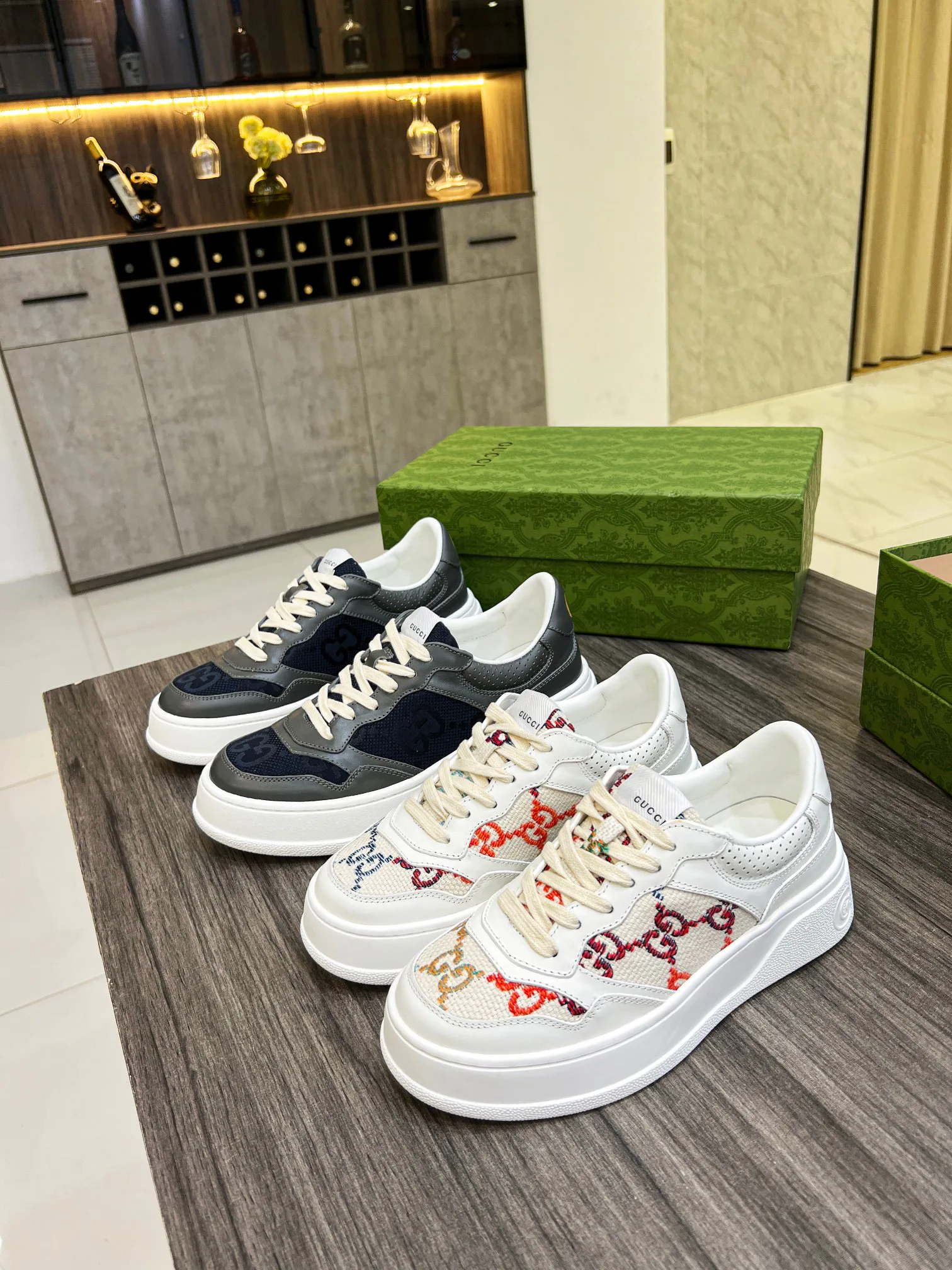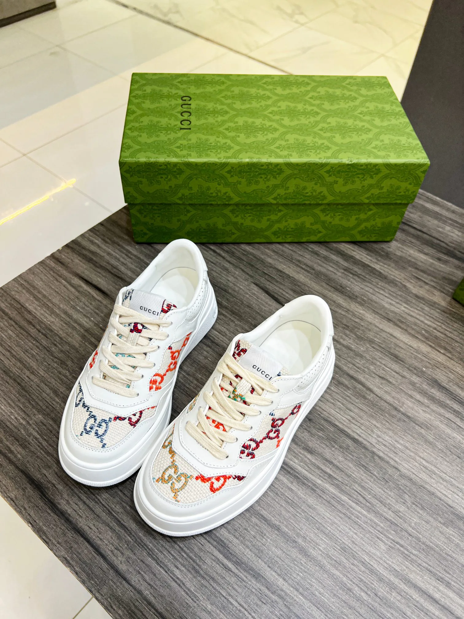 Кроссовки изготовлены из высококачественной кожи с тиснением в виде узнаваемого логотипа GG, что подчеркивает преданность бренду и его историю. Дополнено классическим переплетением букв G, создающим гармоничный акцент.