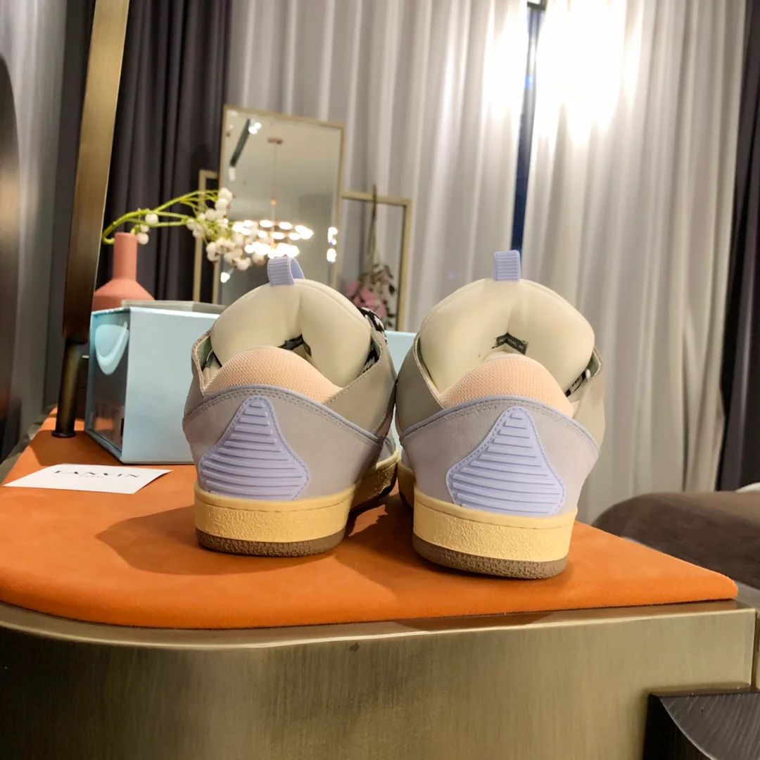 Обувь изготовлена из натуральной кожи, замши и текстиля, с эффектом коллажей и контрастных цветов, что придаёт каждой паре уникальность. Подошва — резиновая с заметной амортизацией, обеспечивая комфорт при носке. Элементы ручной росписи и брызги краски добавляют активный художественный акцент.