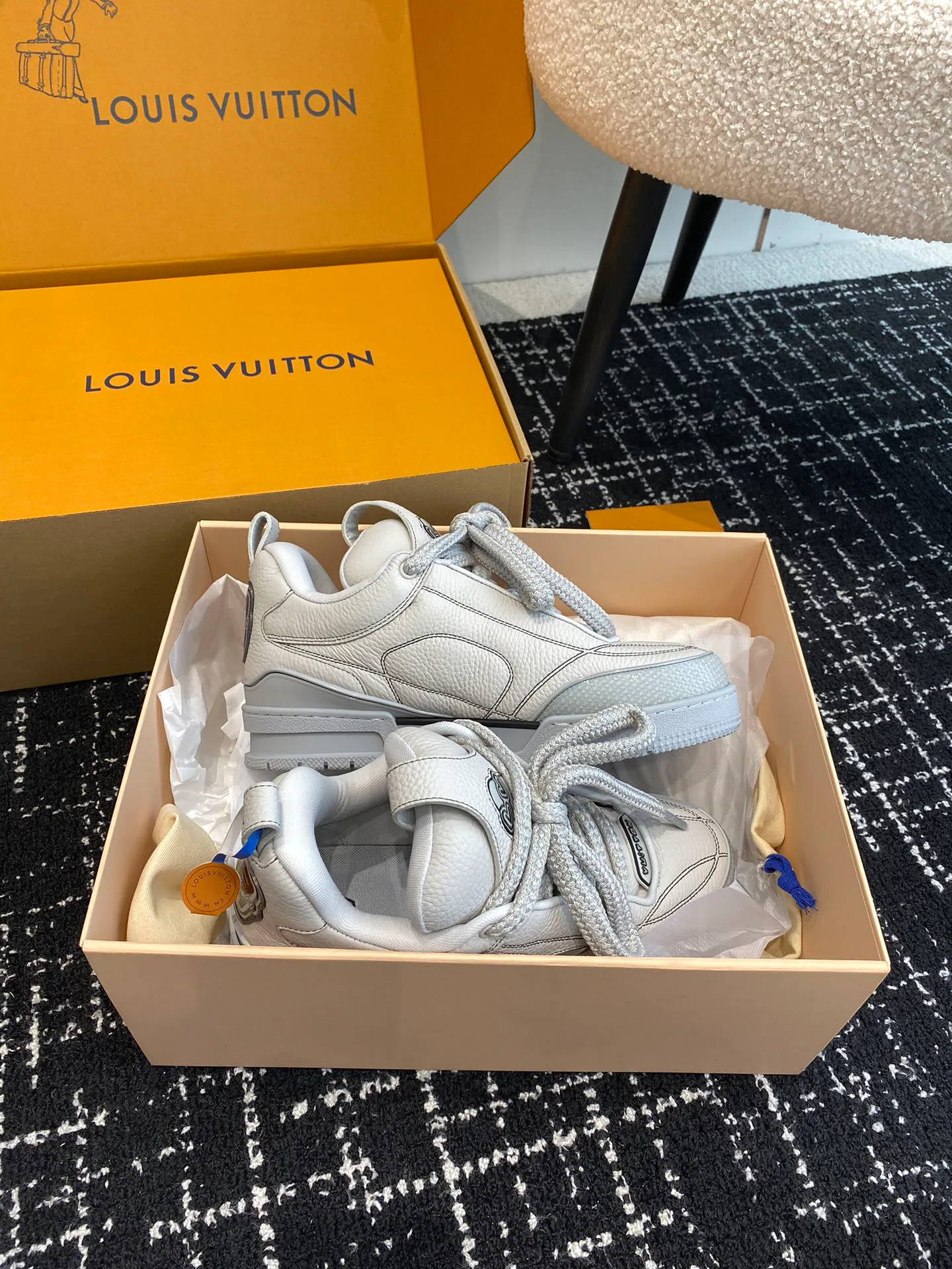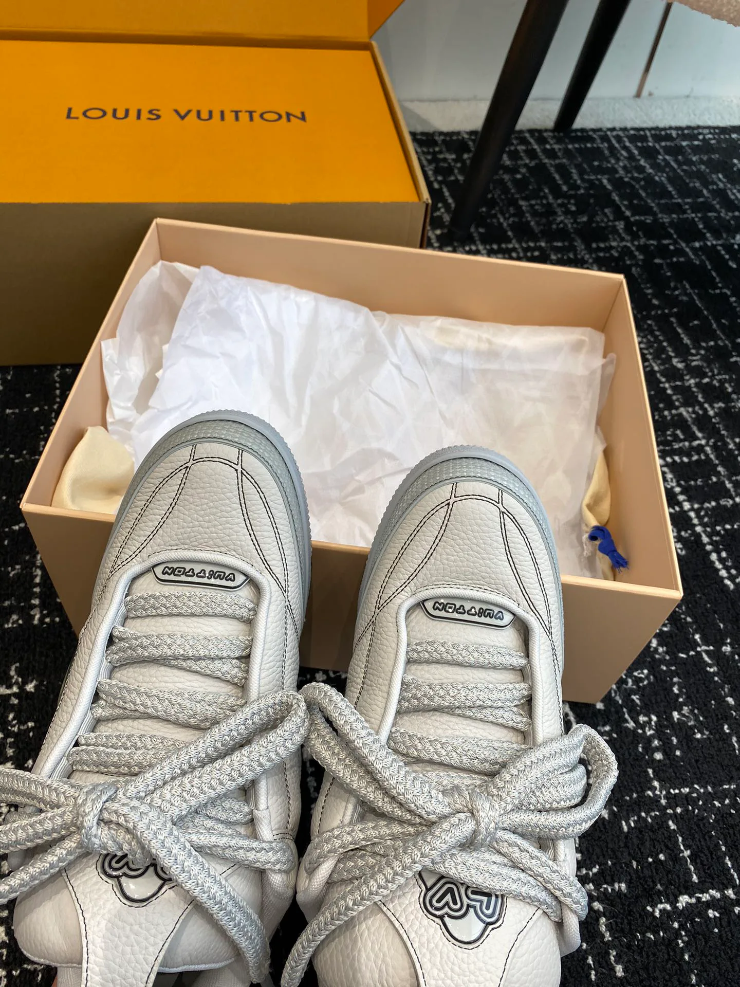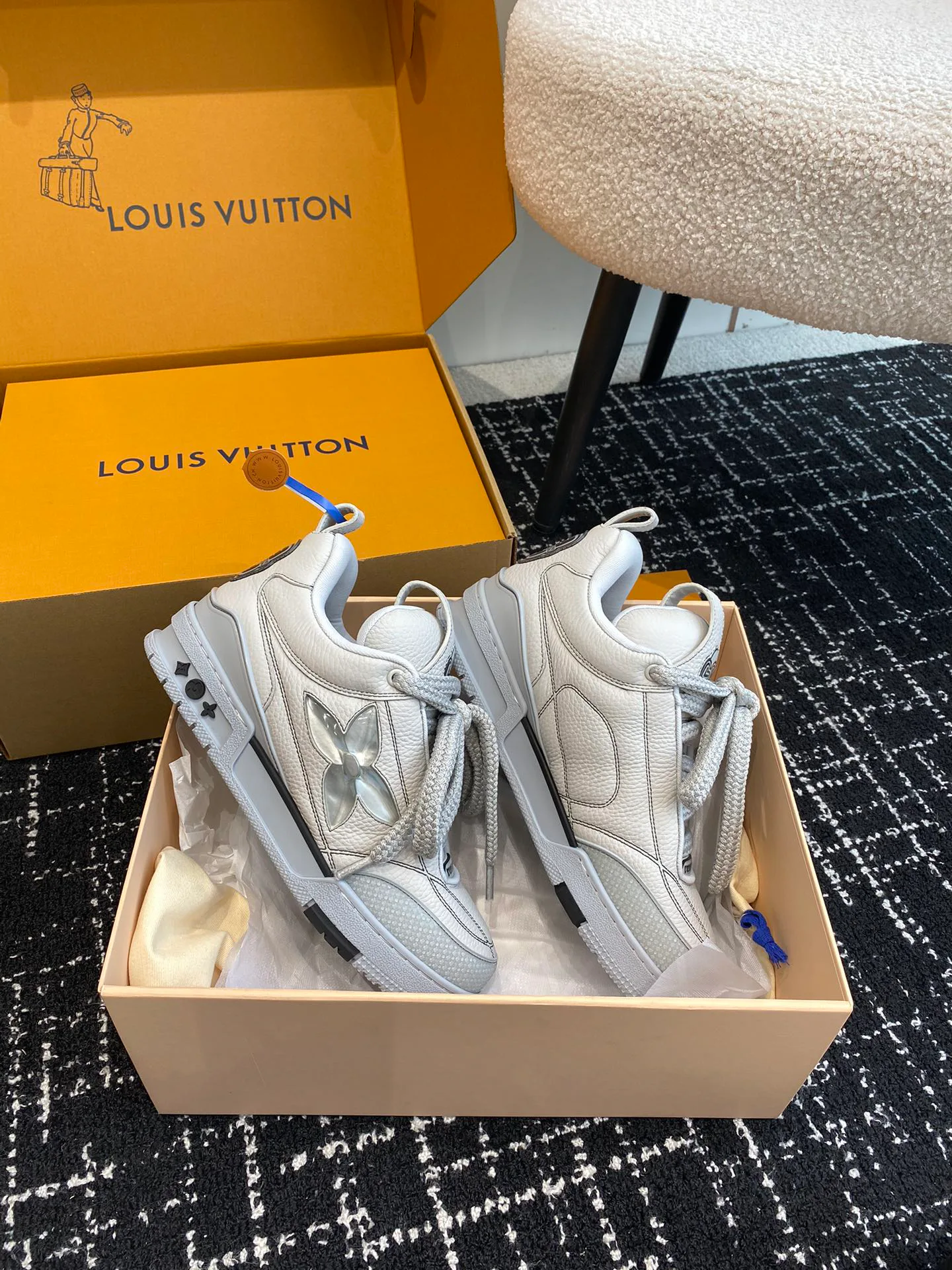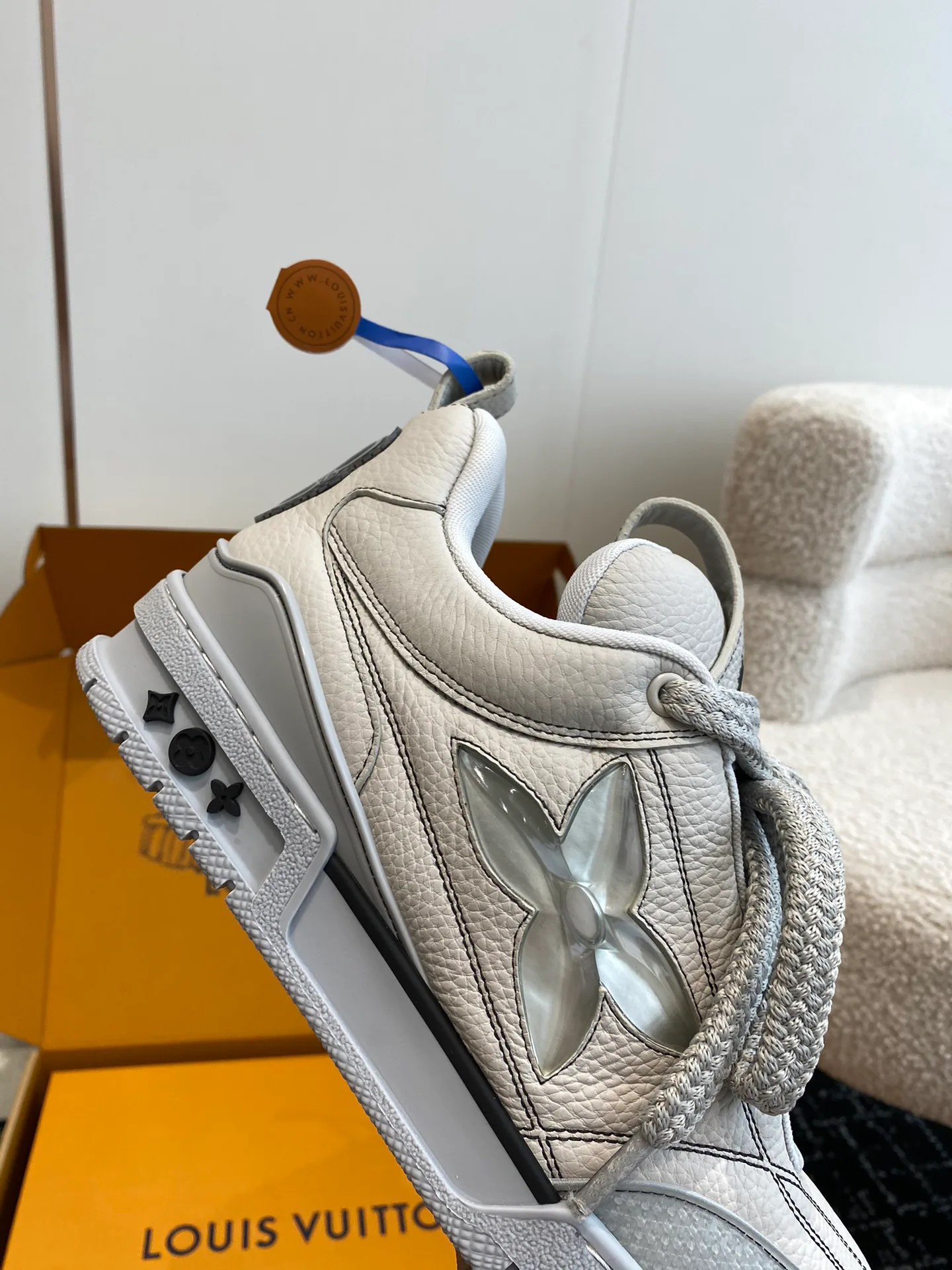 Кроссовки выполнены из зернистой натуральной кожи, что обеспечивает долговечность и стильный вид. Боковая часть украшена крупным цветочным узором в Monogram, придающим яркий акцент. Модель оснащена мягким воротником и язычком, что обеспечивает комфорт при носке.