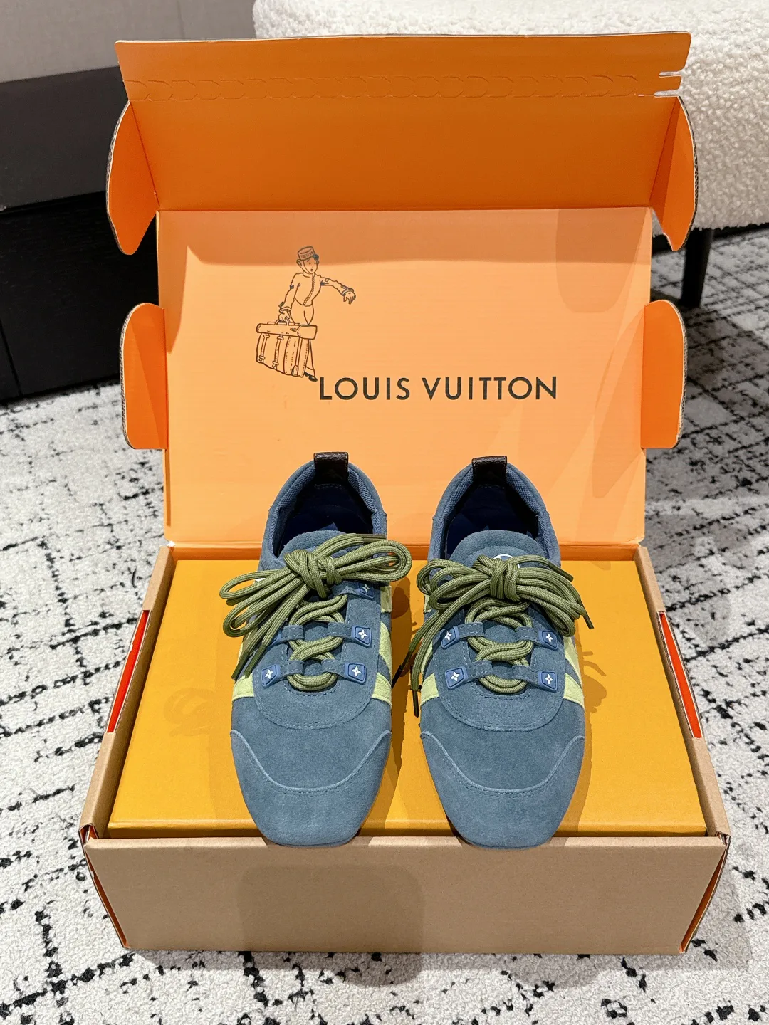 Кроссовки выполнены из высококачественной замшевой кожи, что придаёт им изысканный вид и обеспечивает долговечность. Нежные плавные линии и лёгкая форма делают их удобными. Символика Louis Vuitton, представленная на боковой стороне, и канва с монограммой добавляют изюминку и подчёркивают статус бренда.