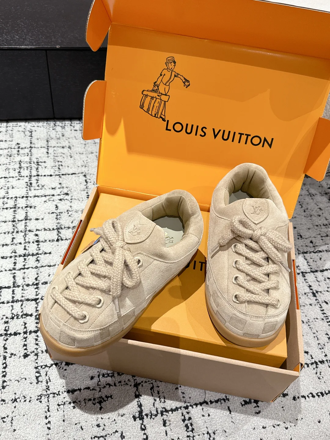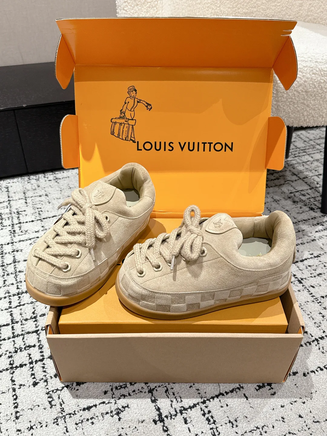 Верх выполнен из оригинальной импортированной кожи, с элементами замши и тиснением Damier. Дышащая сетчатая подкладка гарантирует комфорт при длительном ношении. Оригинальная формовочная TPU-подошва имеет противоскользящее покрытие. Доступные размеры: женские 35–42 и мужские 38–46, с возможностью индивидуальной настройки под конкретные размеры. Обувь упакована в элегантную фирменную упаковку, отражающую уровень коллаборации и дизайна.
