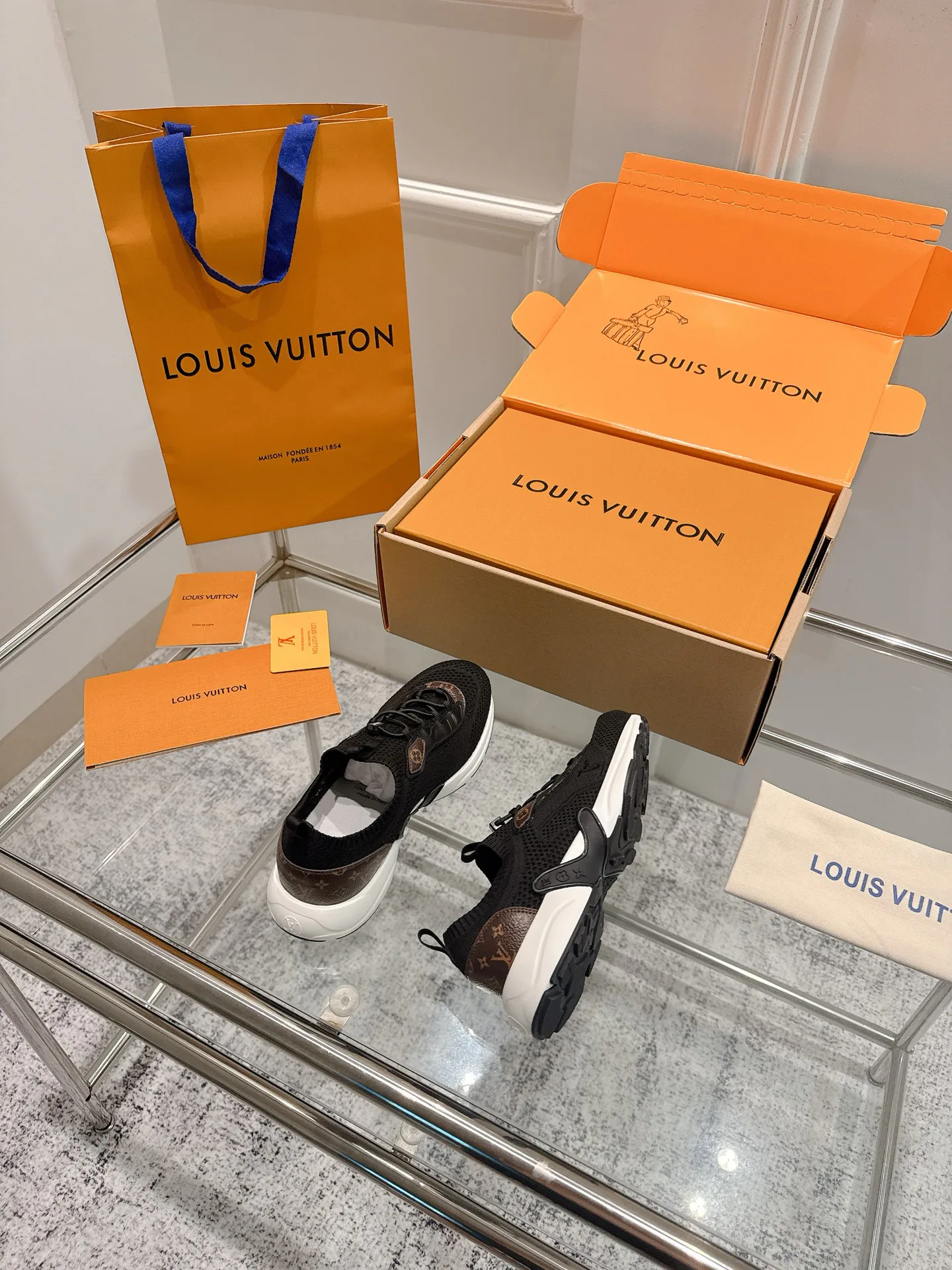 Особенность модели — легкий EVA-материал подошвы, обеспечивающий амортизацию и комфорт. Подошва высотой 3.5 см, что поддерживает плавность движения. Декорированы эмблемой Monogram и буквами LV, кроссовки узнаваемы среди фанатов моды.