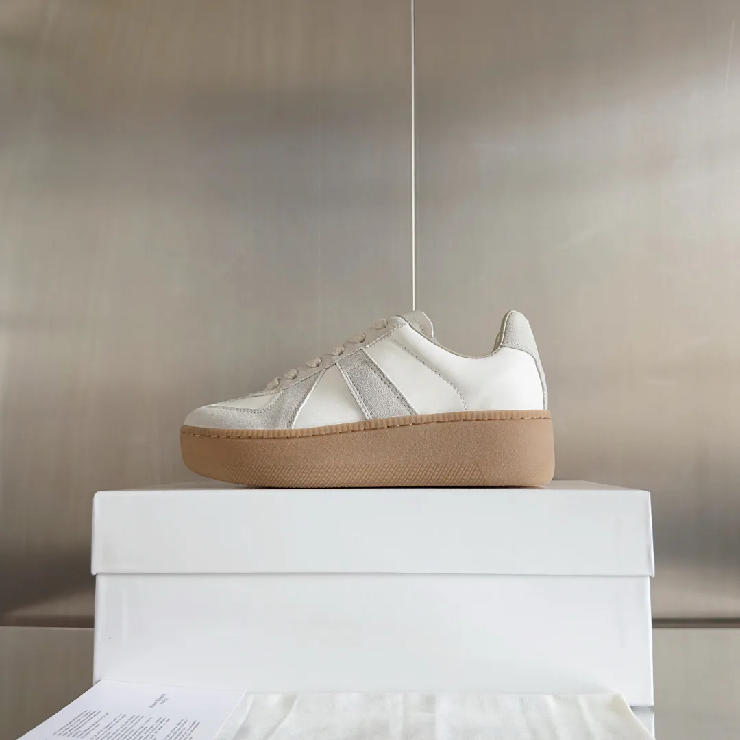 Эта модель подходит для повседневной носки в любое время года. Комфортная посадка обеспечивается мягкой подкладкой и амортизирующей подошвой. Кроссовки имеют классический T-образный кожаный сегмент, вдохновленный военным стилем, с акцентом на ремесленные детали. Размерный ряд включает женские размеры 35–40 EU.