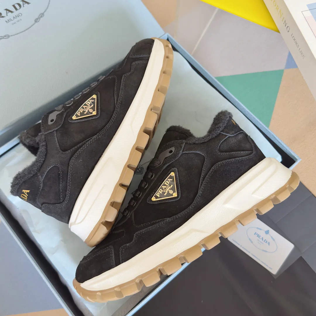 Кроссовки женские PRADA — кроссовки с тёплой толстой подошвой и повседневным спортивным характером. Верх выполнен из оригинальной импортированной коровьей кожи, внутри — импортированная теплая шерсть. Подошва поролоновая, формованная, толщина 4 см. Размеры: женские 35–41, мужские 39–46. Логотип бренда выполнен в виде треугольного эмалированного металлического знака с бархатной отделкой. Изысканная упаковка при выдаче.