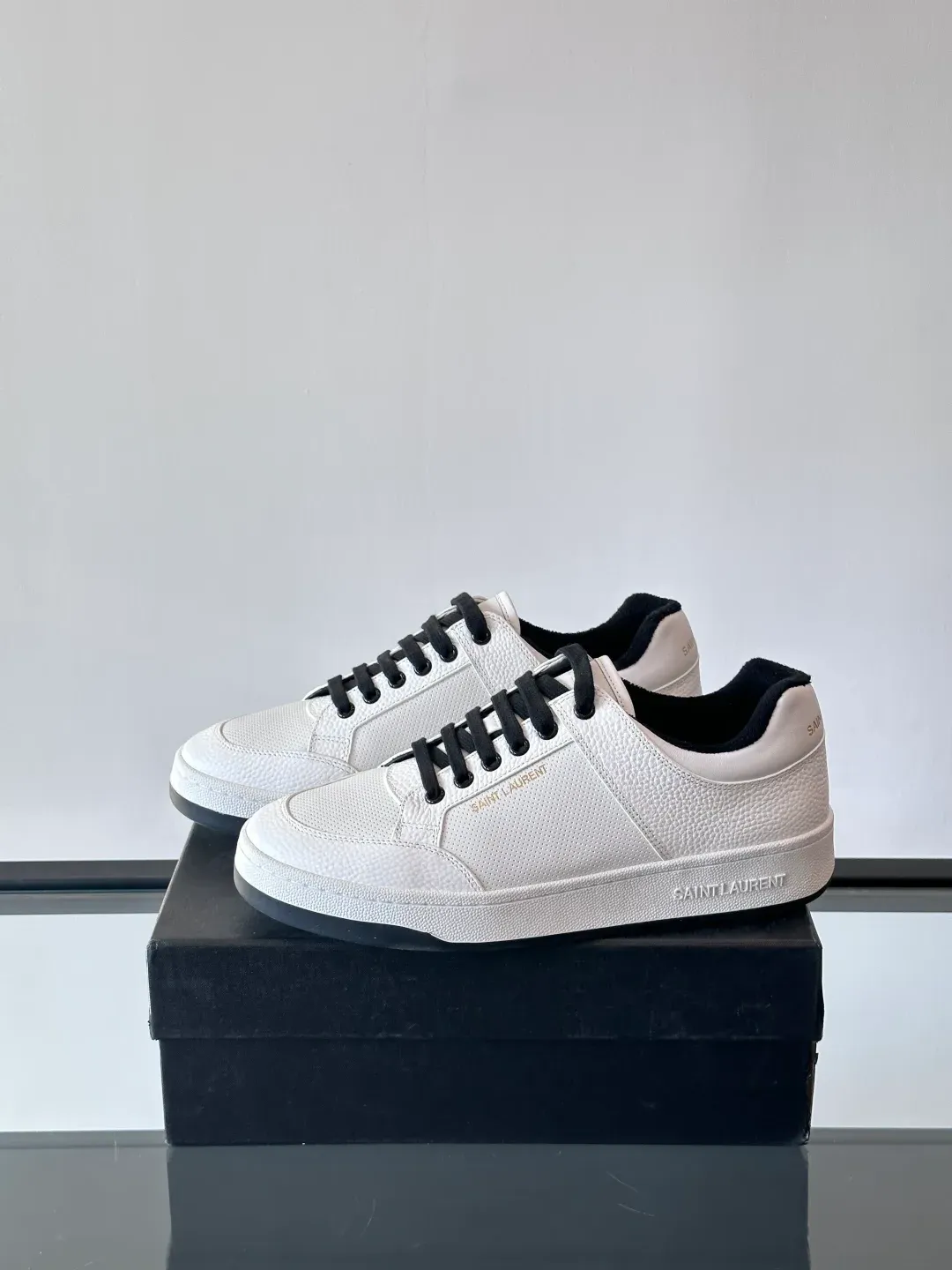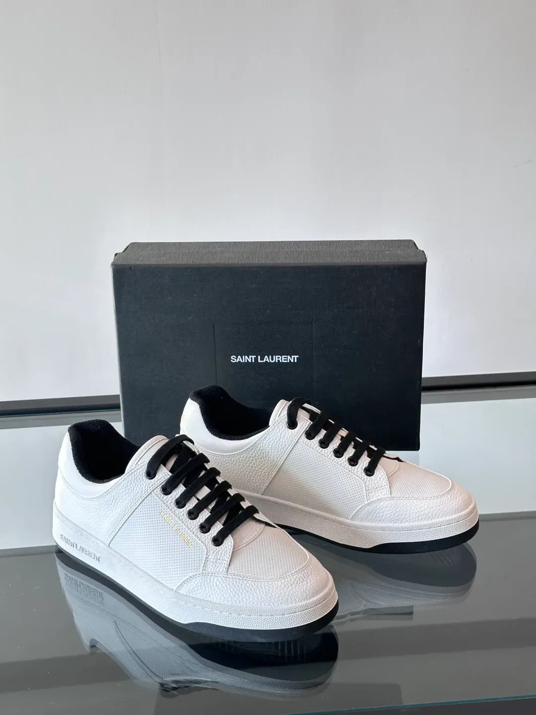 Кроссовки имеют золотистую петлю-подхватку с логотипом SAINT LAURENT и боковую нашивку SL 61. Двухцветная резиновая подошва с прочной строчкой по периметру увеличивает долговечность. Эти кроссовки подчеркивают статус бренда и подходят для стильного повседневного образа. Размеры варьируются от 38 до 44, возможен индивидуальный заказ 45-го размера.