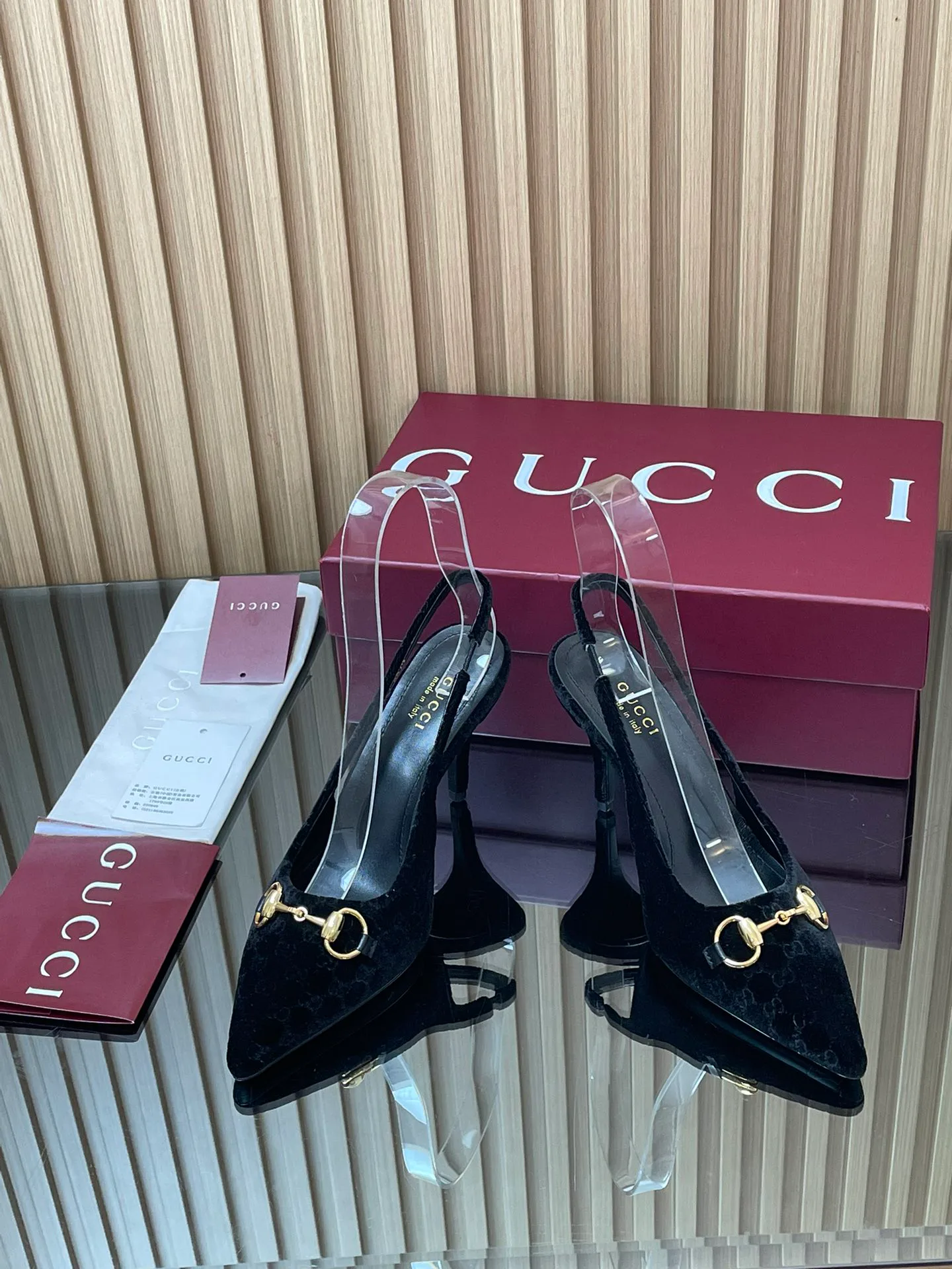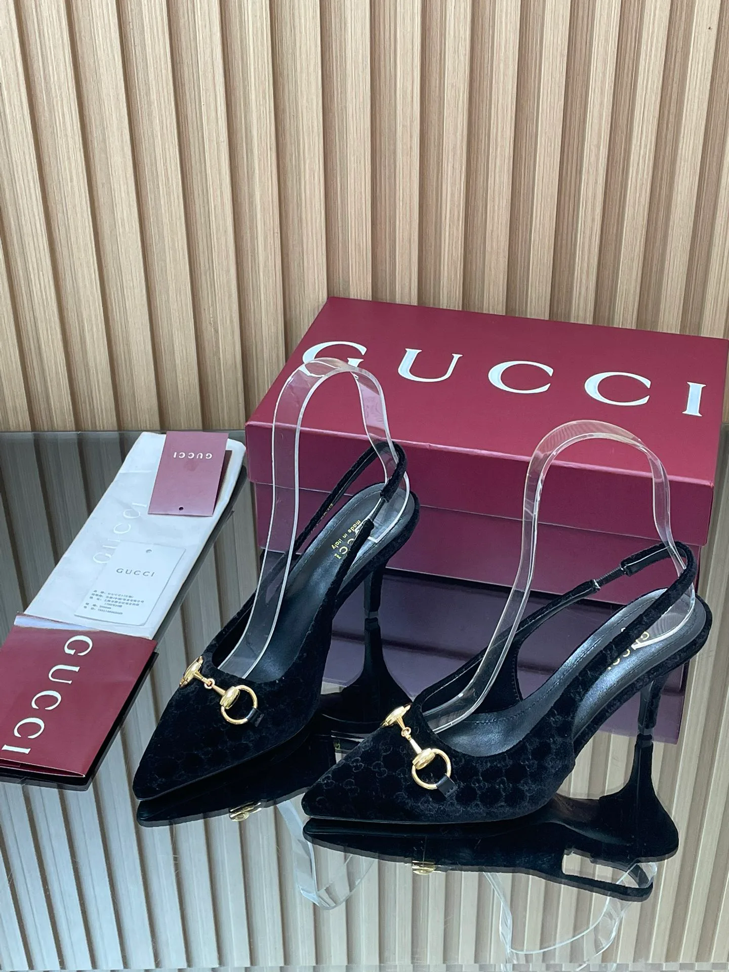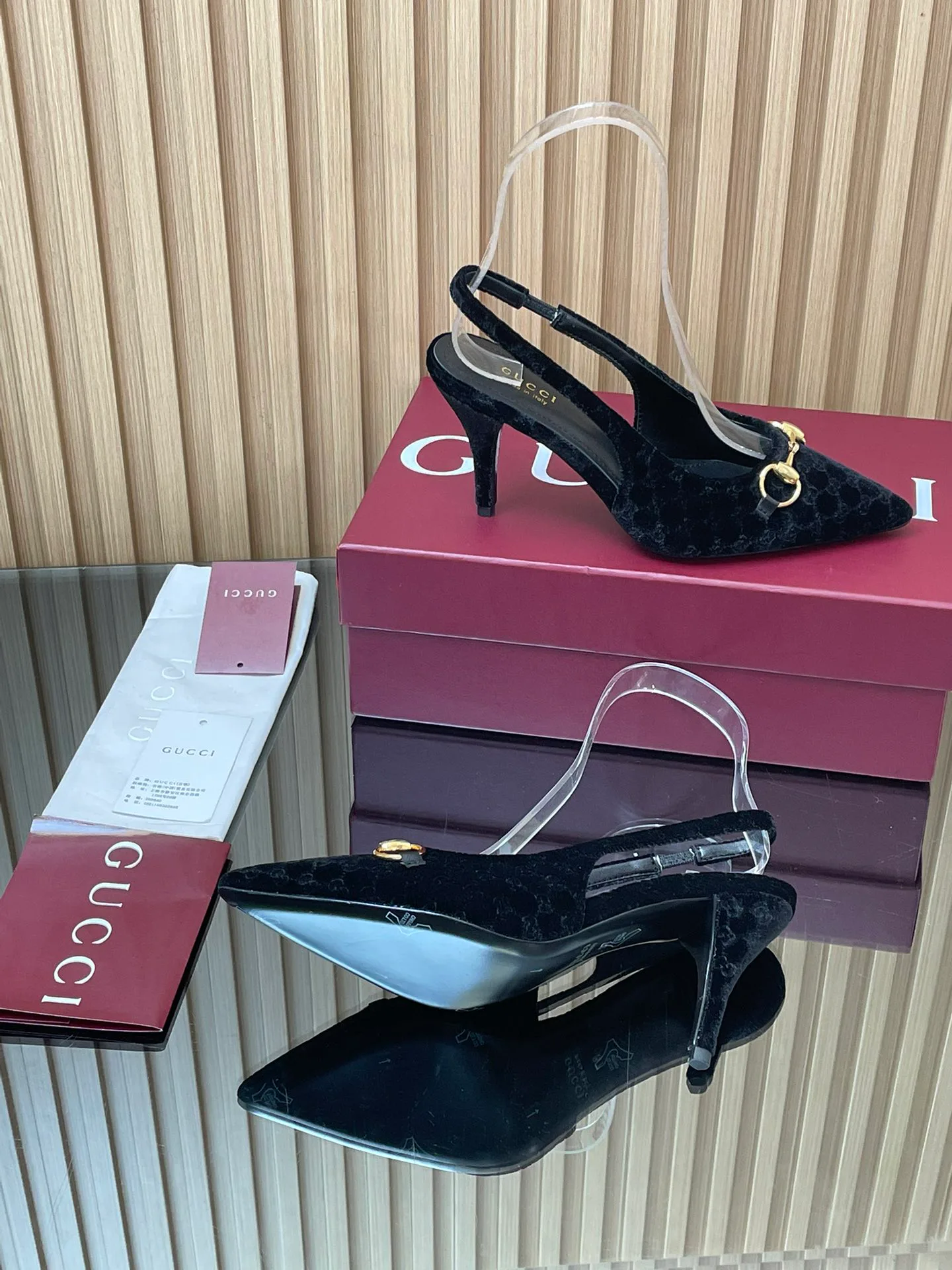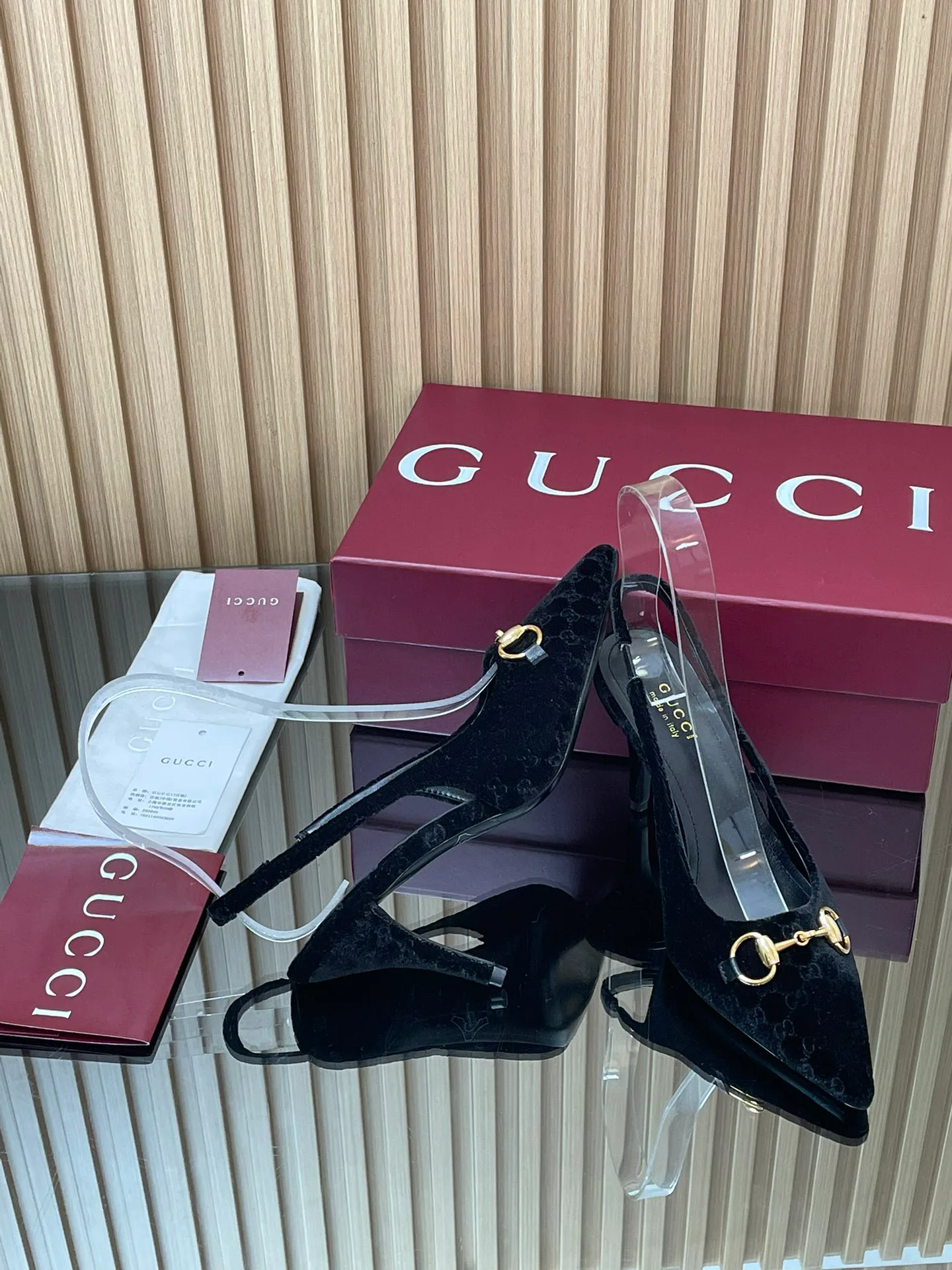 Каблук высотой 8,5 см и платформа 4,5 см создают баланс комфорта и элегантности. Модель дополнена центральной золотистой пряжкой horsebit и эластичной системой на щиколотке для надёжной посадки. Размерный ряд варьируется от 35 до 42, причём для размеров 40, 41 и 42 изготовление осуществляется по заказу. Упаковка включает полный набор в оригинальной красной упаковке.