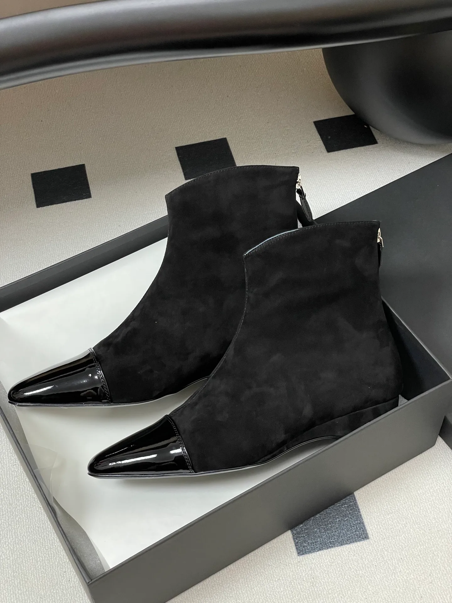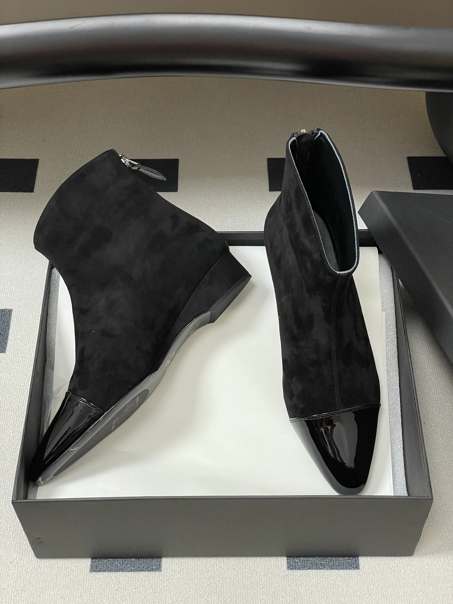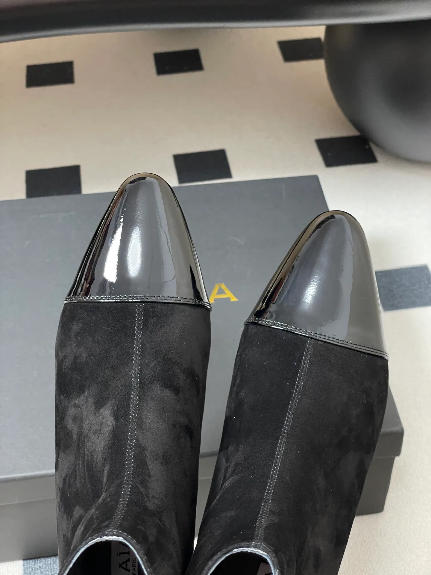 Изнутри ботильоны отделаны мягкой овечьей кожей для комфорта на подъеме. Итальянская кожаная подошва обеспечивает прочность и отличную амортизацию. Размерный диапазон составляет 35–39, возможно изготовление на заказ в размерах 40–43. Уход за моделями требует использования специализированных средств для замши или мягкой ткани для лакированной кожи.