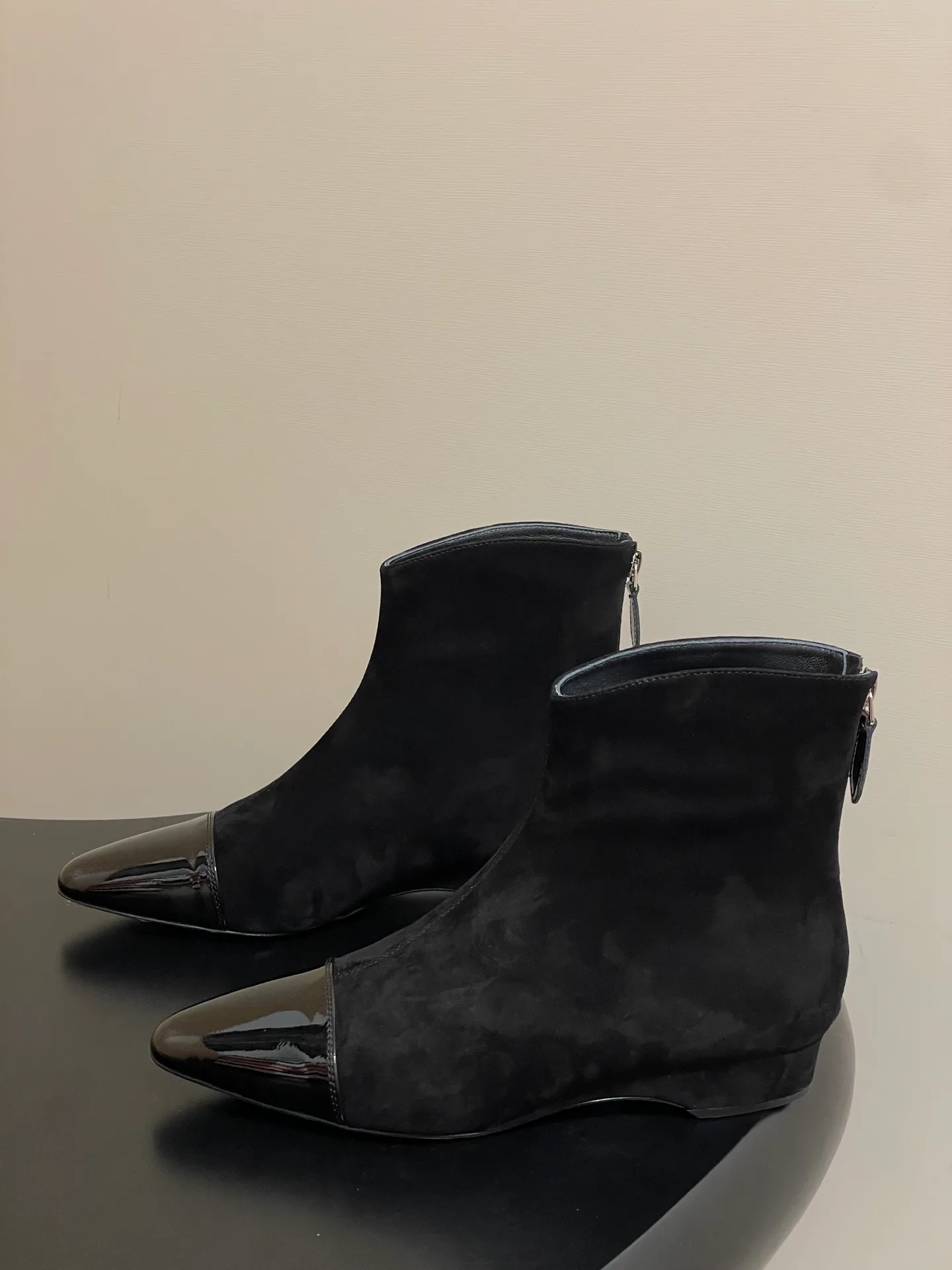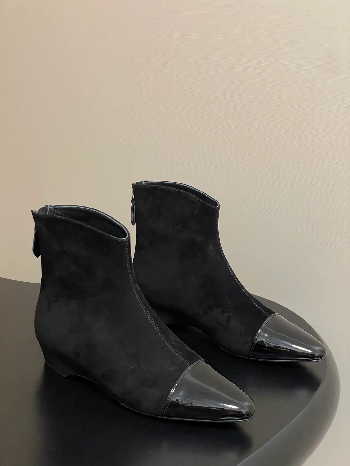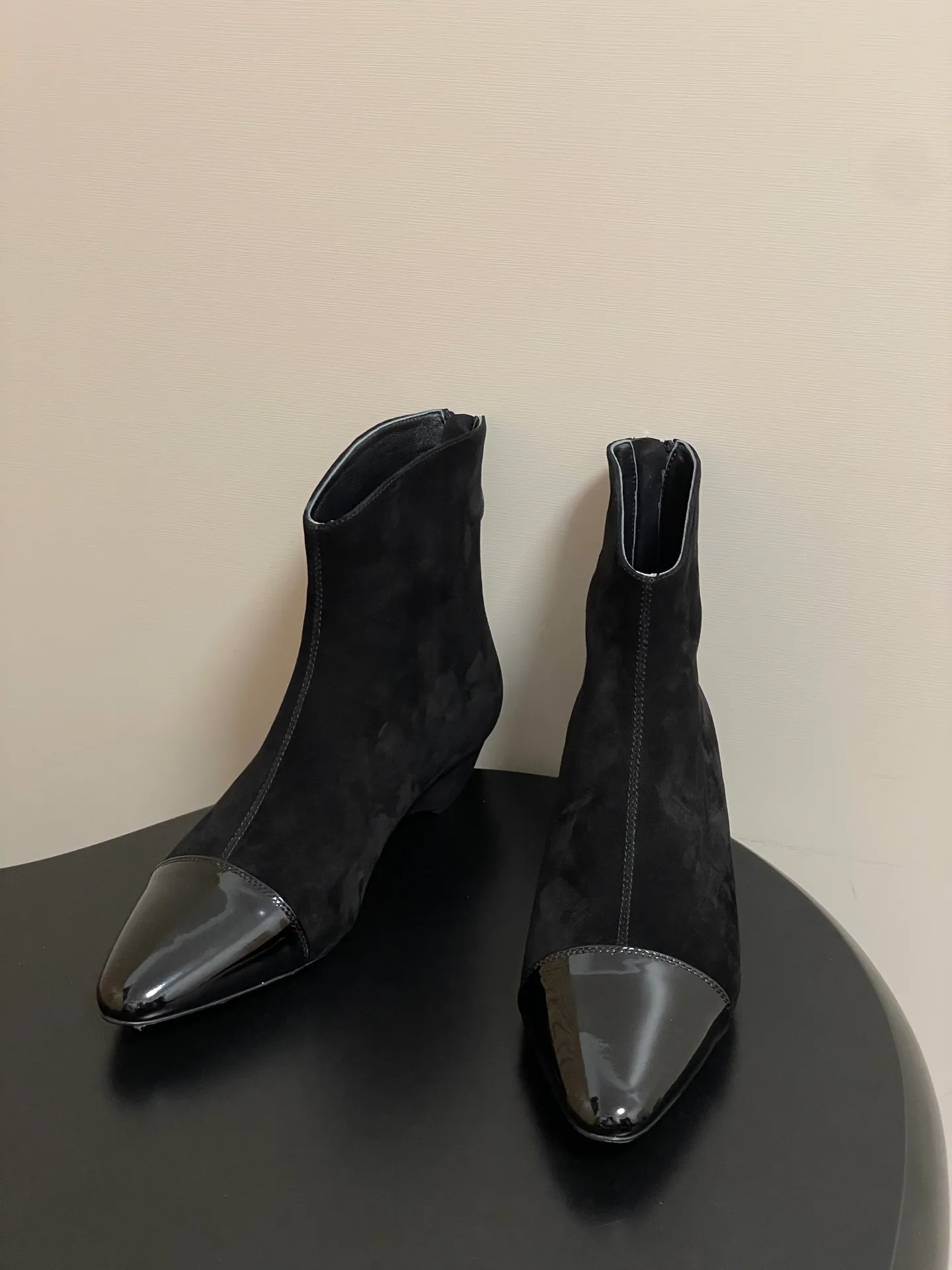 Изнутри ботильоны отделаны мягкой овечьей кожей для комфорта на подъеме. Итальянская кожаная подошва обеспечивает прочность и отличную амортизацию. Размерный диапазон составляет 35–39, возможно изготовление на заказ в размерах 40–43. Уход за моделями требует использования специализированных средств для замши или мягкой ткани для лакированной кожи.