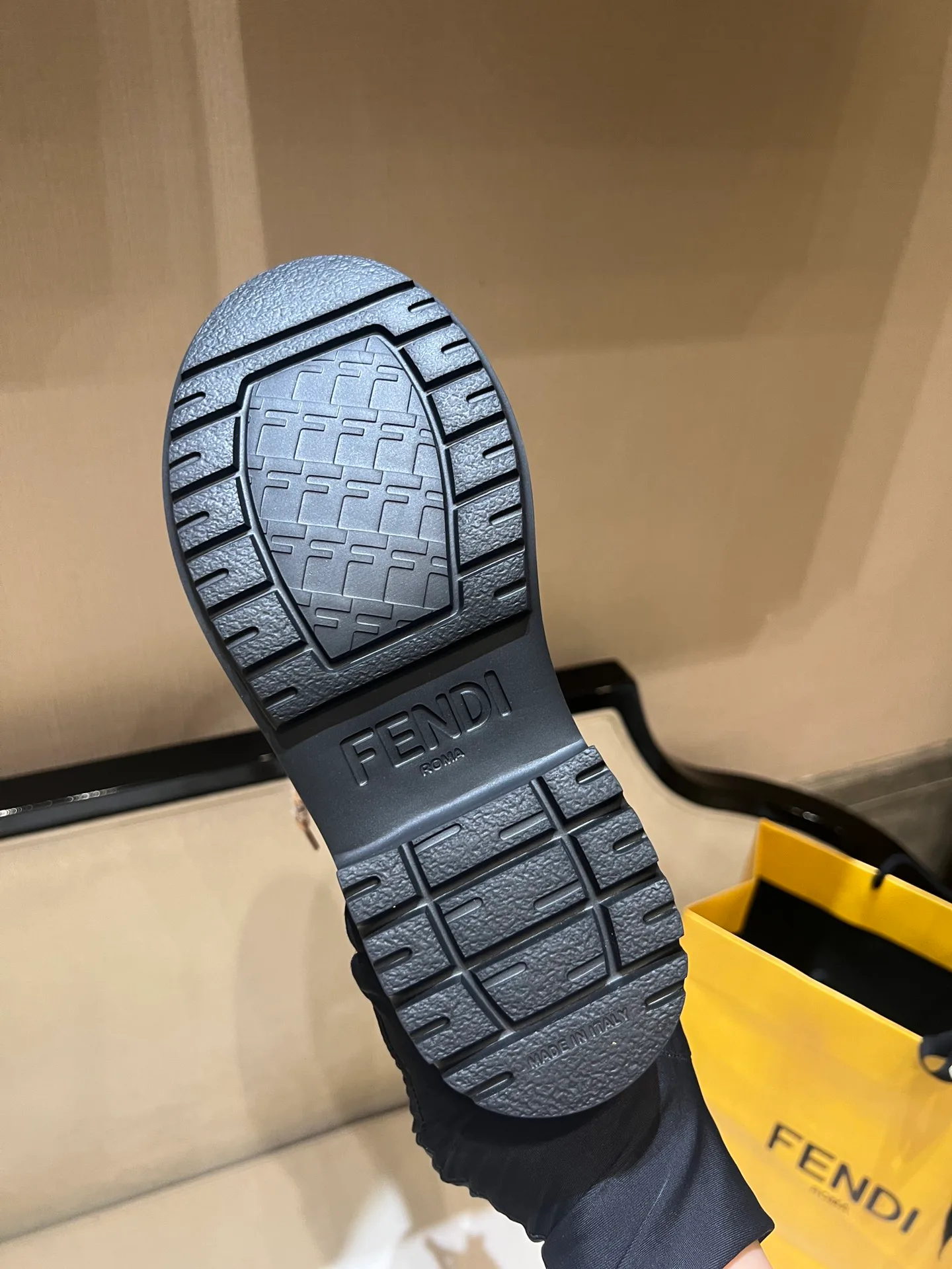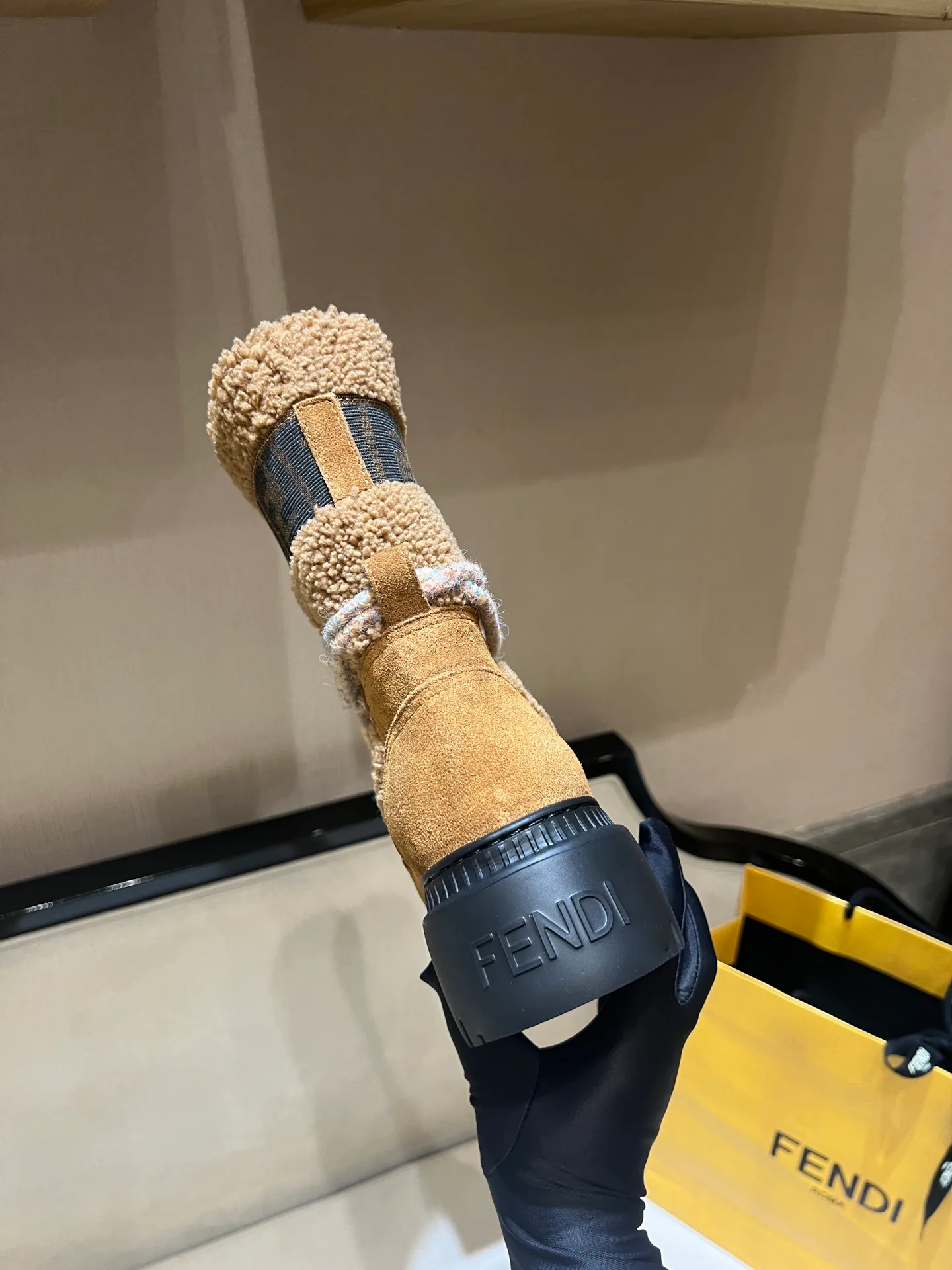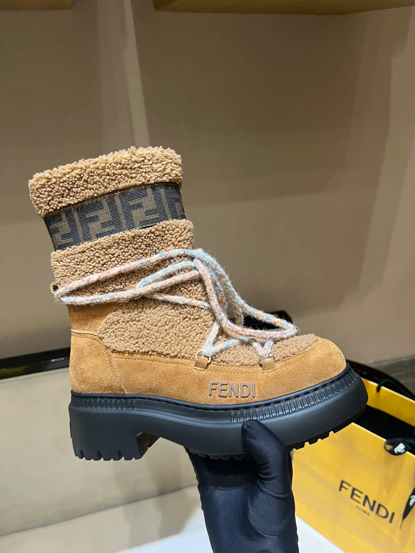 Внутренняя подкладка голенища выполнена из шерсти, а внутри ботинка используется коротковорсовая шерсть для тепла и комфорта. Оригинальная подошва с задником имеет тиснение логотипа FENDI, что подчеркивает уникальность каждой пары. Размерный ряд составляет 34–41. Продукт относится к эксклюзивной коллекции и рассчитан на зимний сезон.