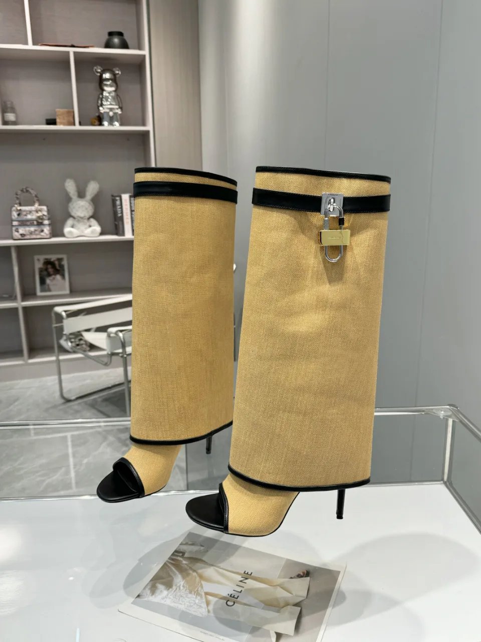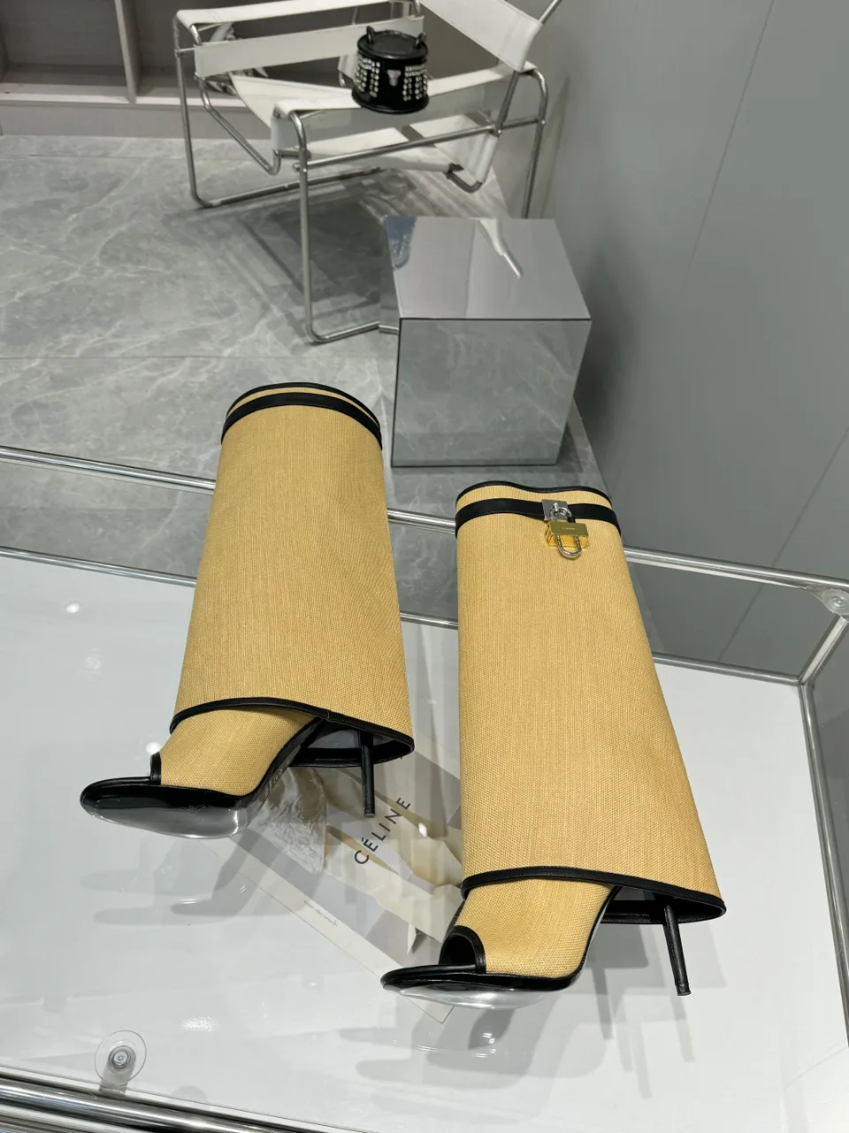 Обувь доступна в размерах 35–39, размеры 40 и 42 изготавливаются на заказ. В конструкции предусмотрены декоративные металлические элементы и кожаный ремень вдоль голенища для акцента. Подкладка также выполнена из натуральной кожи. Для ухода рекомендуется использовать средства для защиты натуральной кожи и хранить обувь в оригинальной упаковке.