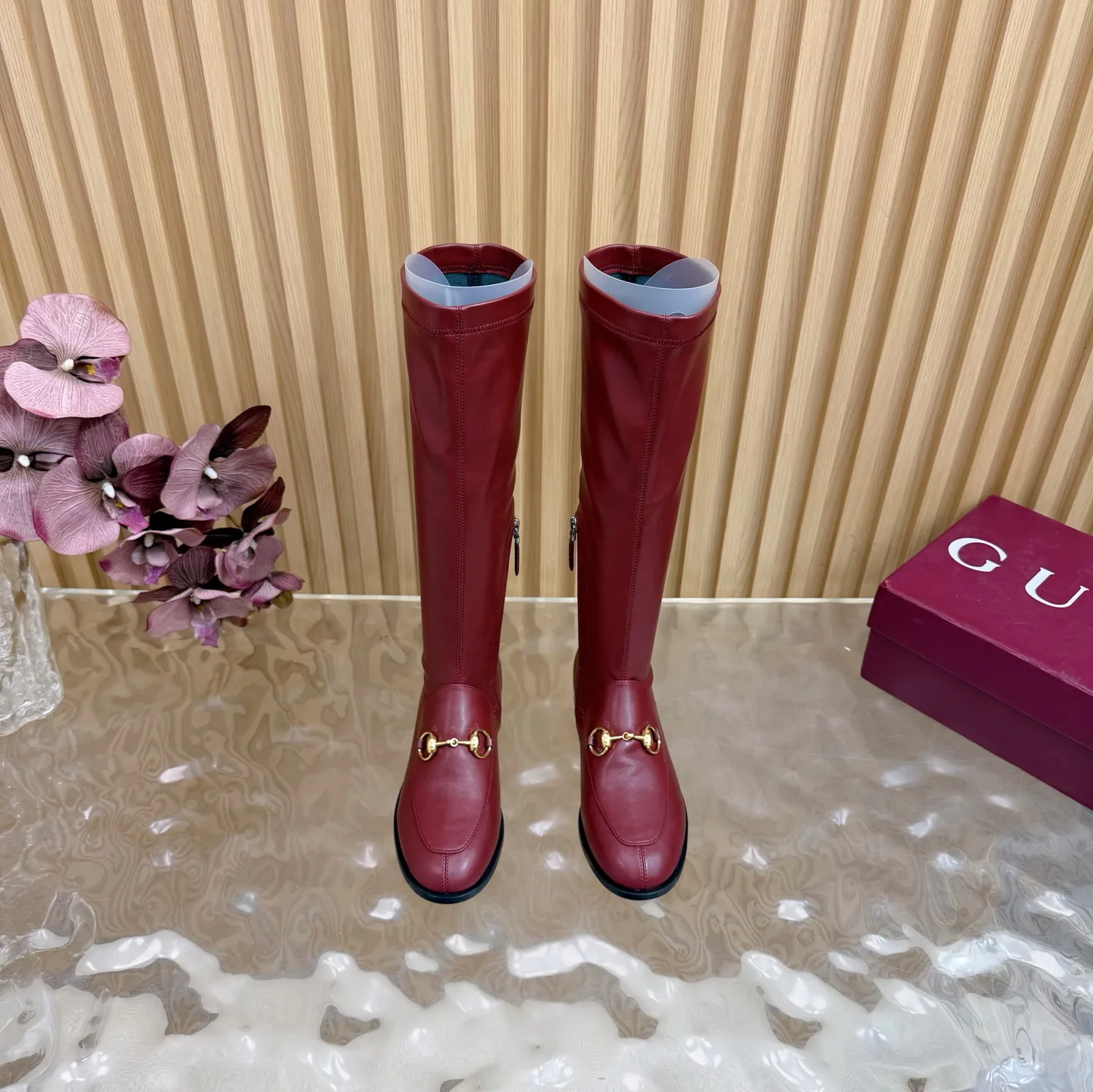 Сапоги женские GUCCI — длинные сапоги с конской пряжкой и квадратным носком, предназначенные для осени 2025 года. Материалы: верх — оригинальная импортированная телячья кожа и эластичная мягкая кожа ягненка; внутренняя подкладка — кожа ягненка. Подошва — итальянская натуральная кожа, высота каблука 2,5 см. Размеры: 35–42; изготовление под заказ 40, 41, 42; возврат и обмен не предусмотрены. Полная комплектация в премиальной упаковке.