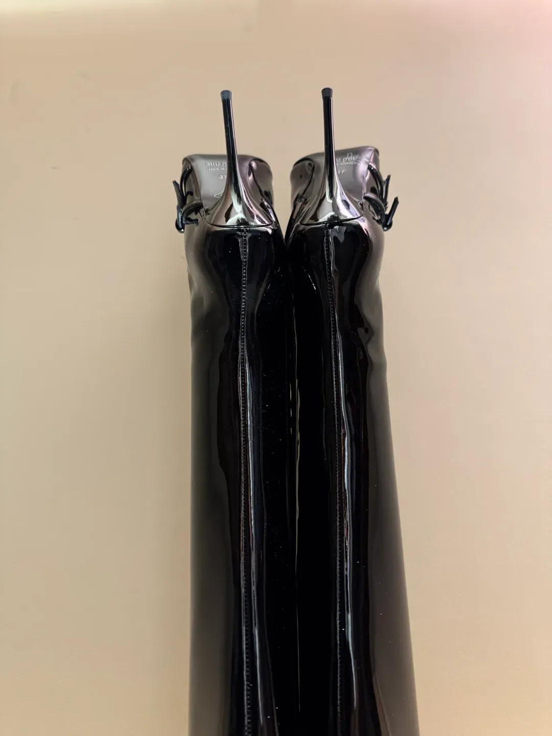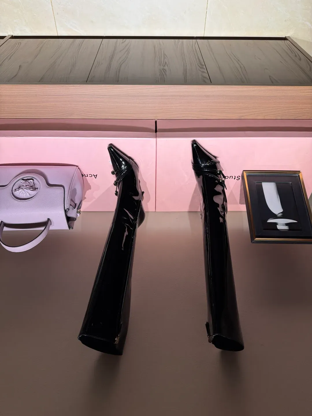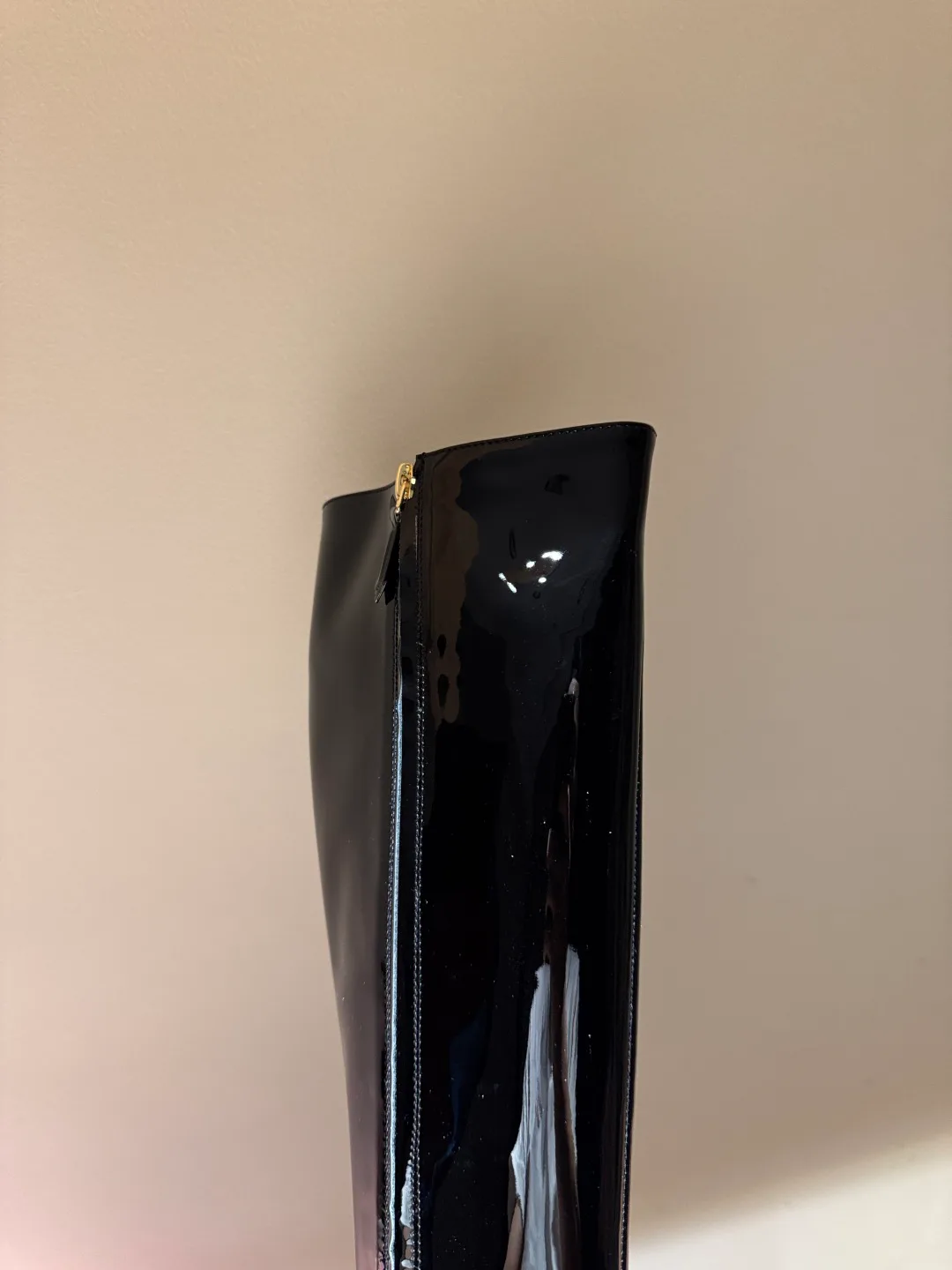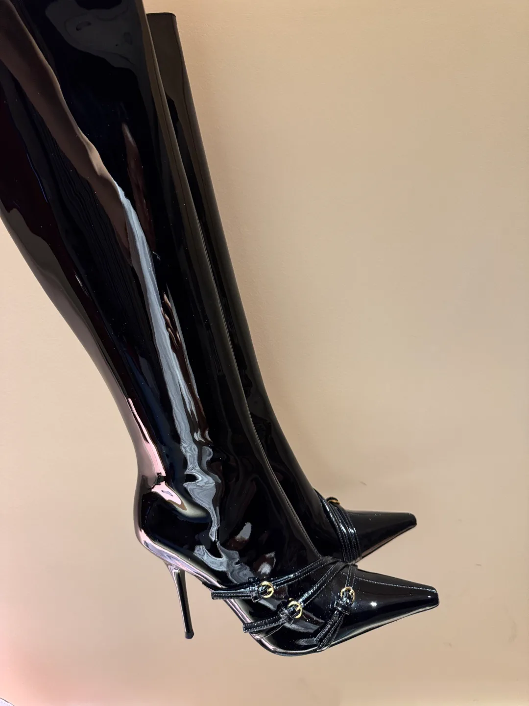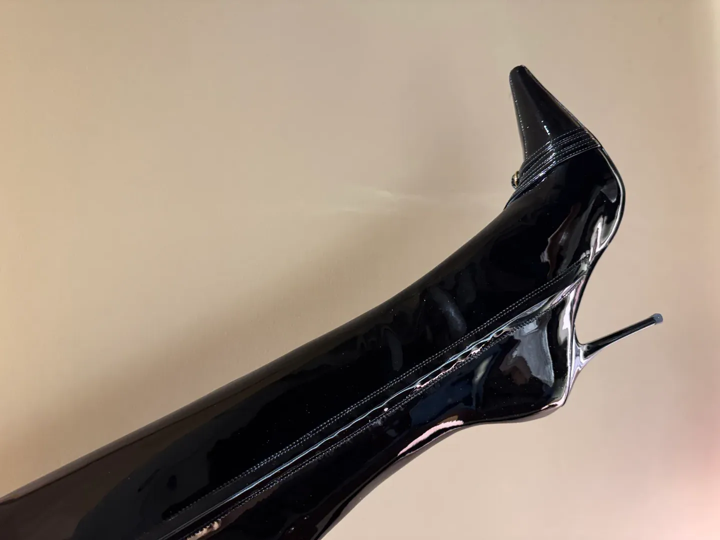 Особенности дизайна: лакированная поверхность подчёркивает стиль. Заострённый носок добавляет выразительности. Модель не требует идеальной подгонки под форму стопы — выглядит гармонично на любой фигуре. Сапоги создают баланс пропорций и элегантно смотрятся с юбками, платьями и джинсами.