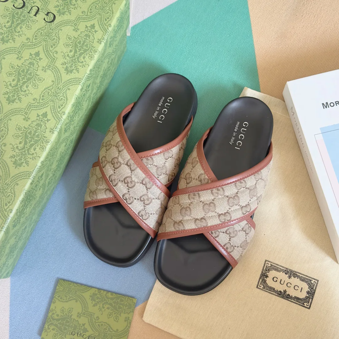 Шлепанцы женские GUCCI — стильная модель с тиснёным логотипом GG и перекрестным дизайном ремешков.