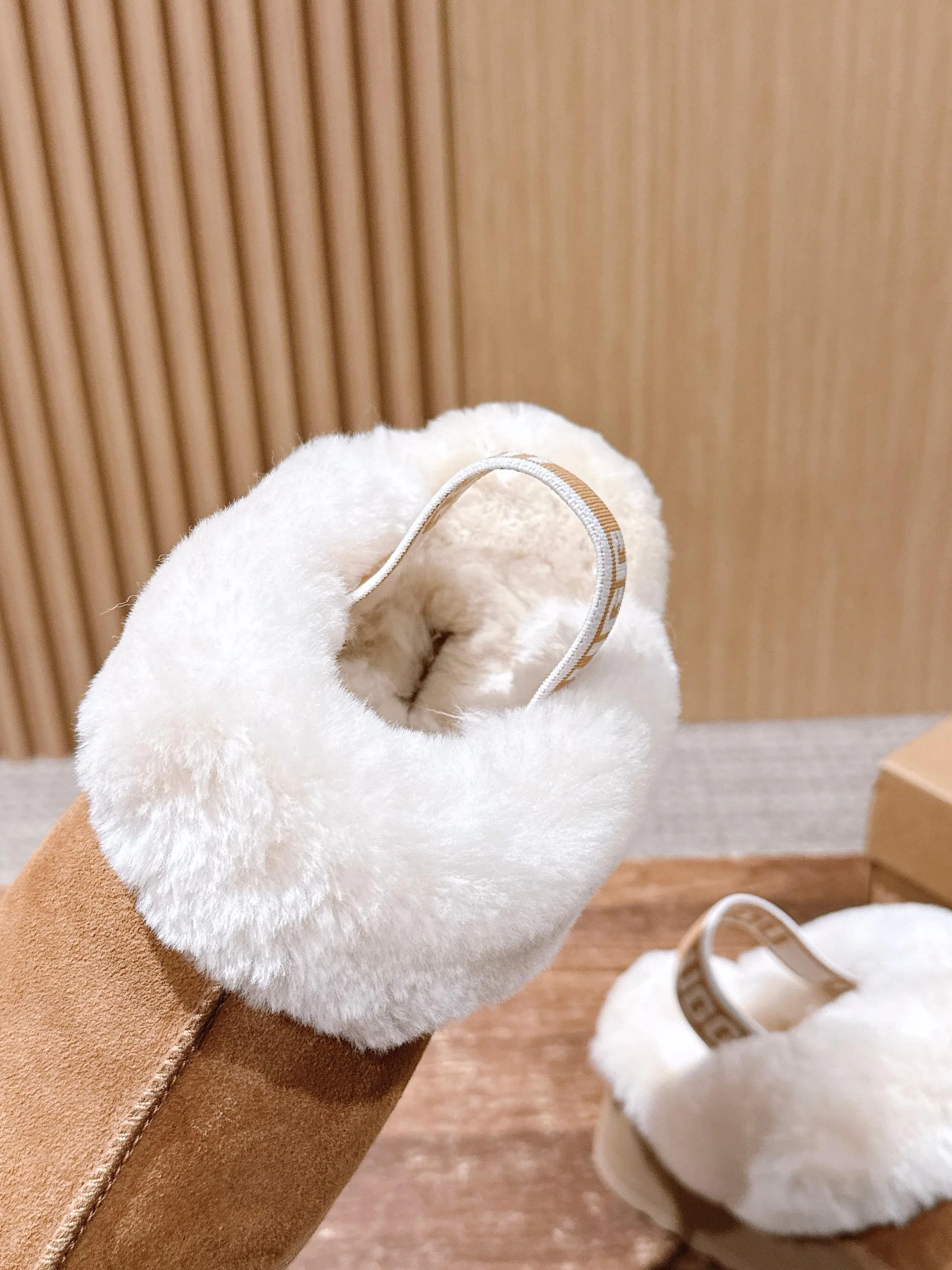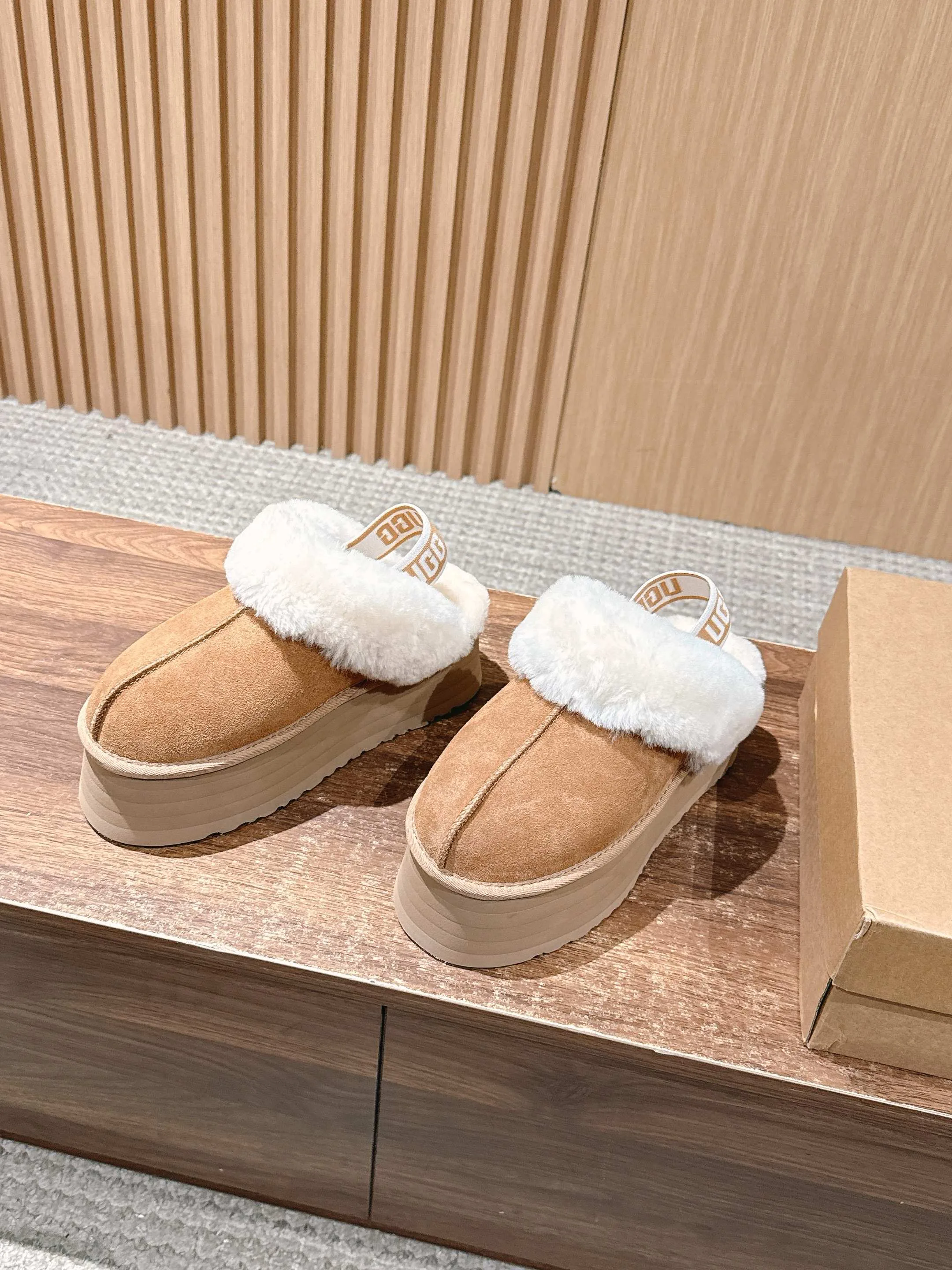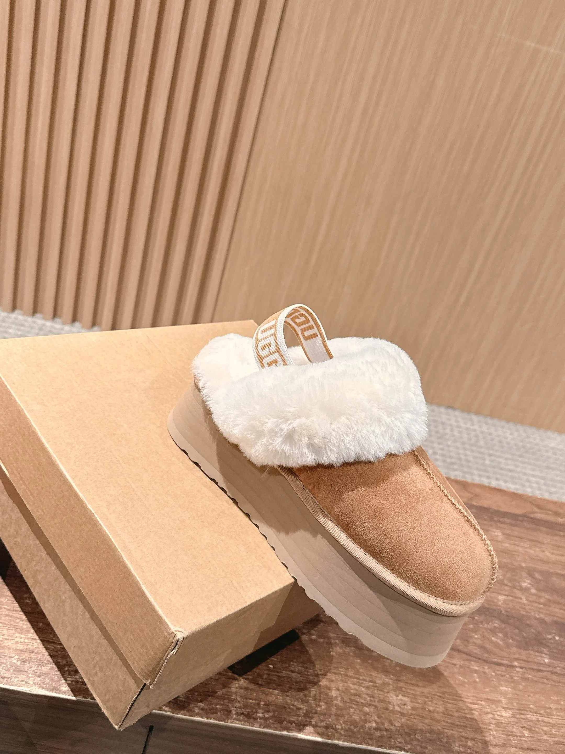 Особенности: закрытый носок и цельный меховой дизайн. Верх с меховой отделкой и кожей обеспечивает комфорт и уход. Подкладка теплая и приятная на ощупь. Подошва из трёх слоёв EVA-пены с упругостью — амортизация, износостойкость и сцепление. Высота подошвы около 5 см.