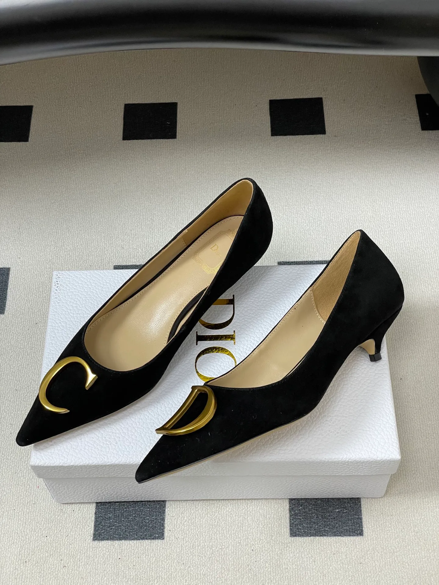 Туфли женские CHRISTIAN DIOR — модель из коллекции ранней весны 2026 года, представленная на показе. Дизайн от Jonathan Anderson сочетает классическую черную остроносую форму с золотой металлической пряжкой в виде фирменных букв. Модель доступна на каблуке высотой 8.5 или 3.5 сантиметра. Верх выполнен из кожи, внутренняя часть — из овчины, а подошва — из натуральной кожи.