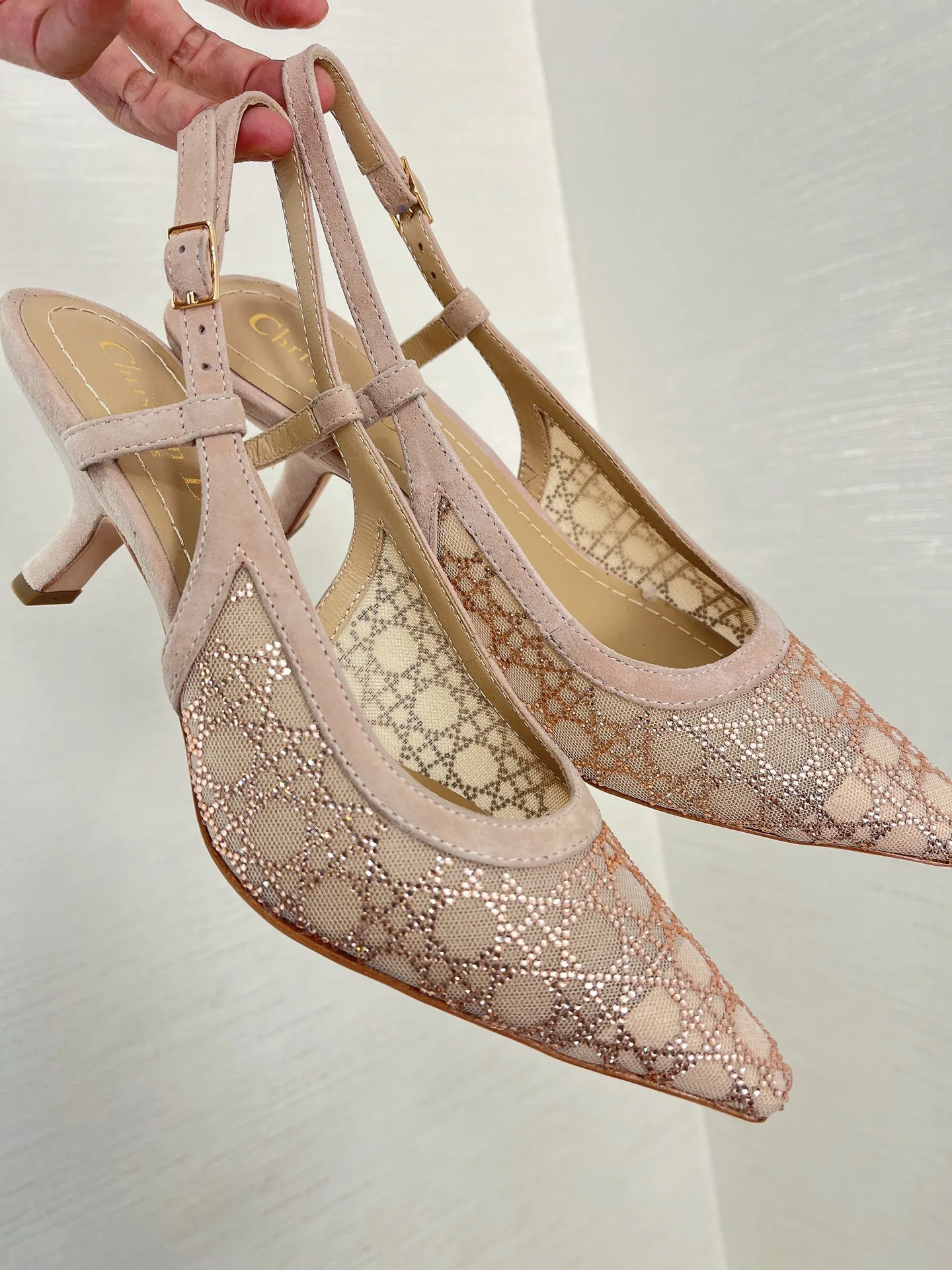 Туфли имеют маленький квадратный нос, что придаёт аккуратность. Каблук в форме запятой доступен в двух вариантах высоты — 6.5 см и 10 см. Дизайн backless с регулируемой шнуровкой и пряжкой обеспечивает надежную посадку. Подошва из телячьей кожи содержит символ удачи CHRISTIAN DIOR, а итальянское производство гарантирует внимание к деталям.