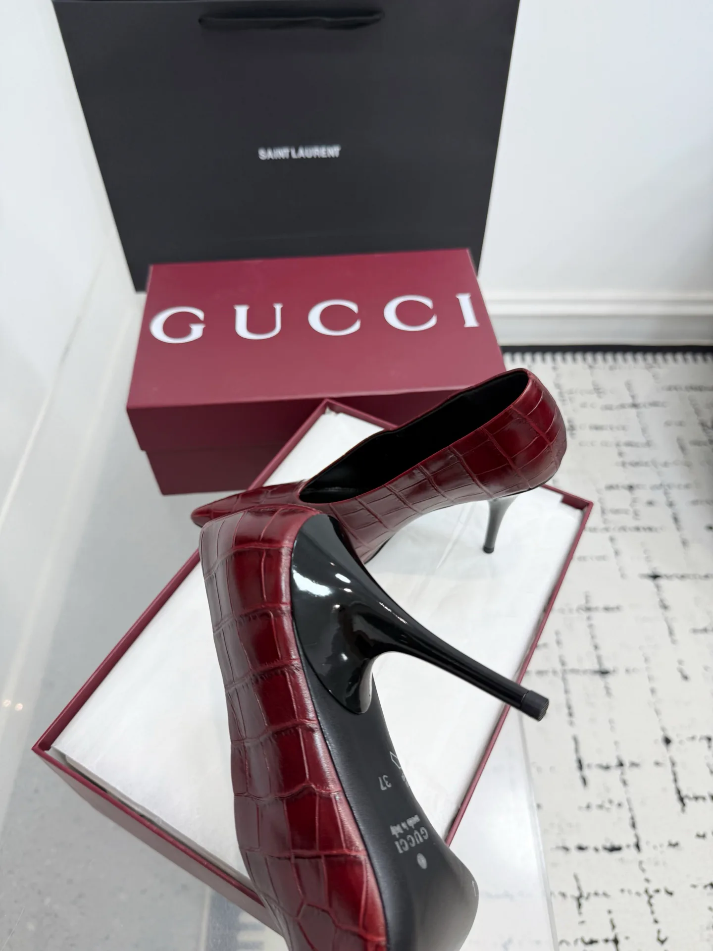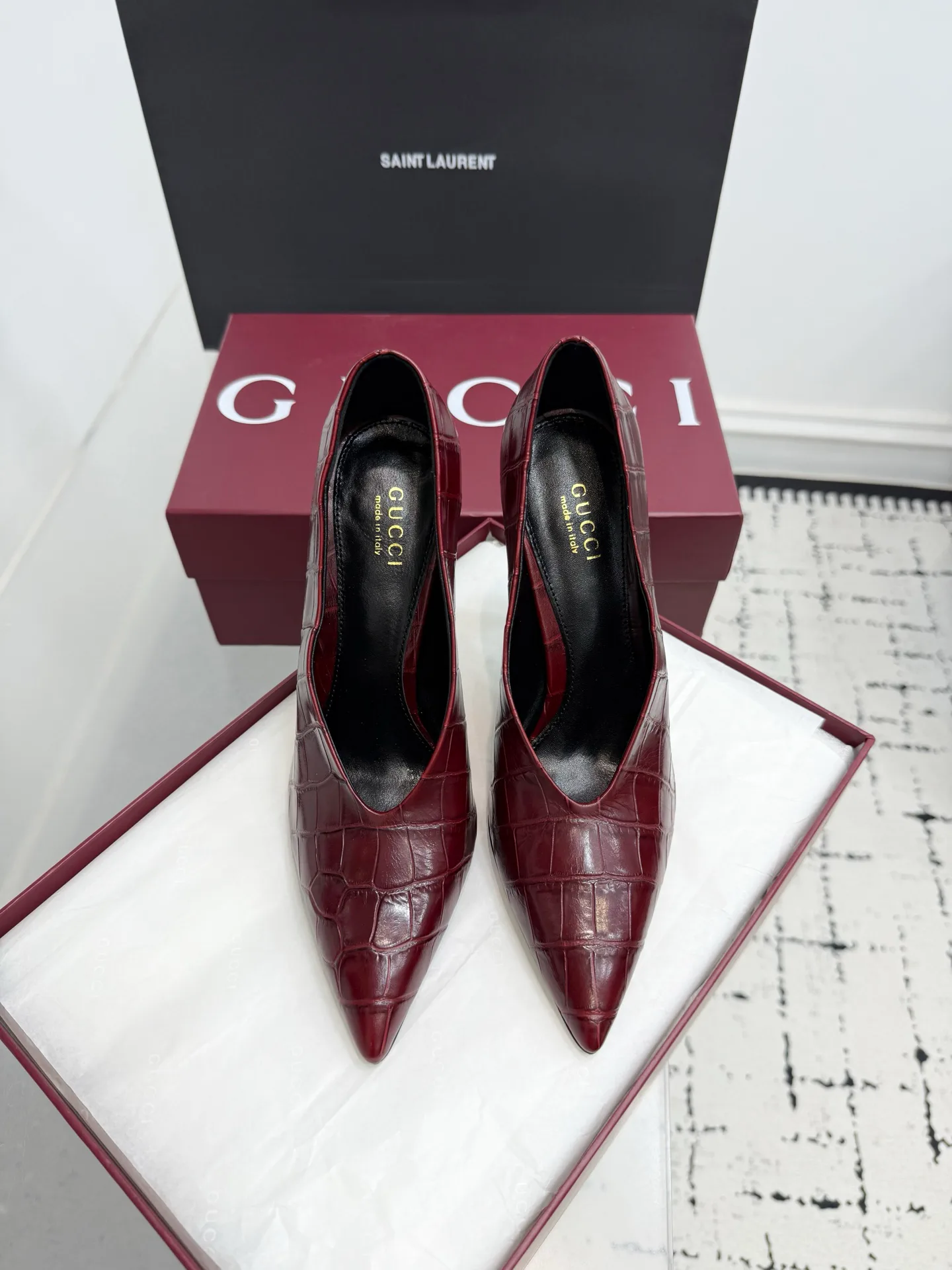 Для ухода рекомендуется чистить туфли влажной мягкой тканью, избегать прямого солнечного света и длительного воздействия влаги, а также хранить в коробке при комнатной температуре.