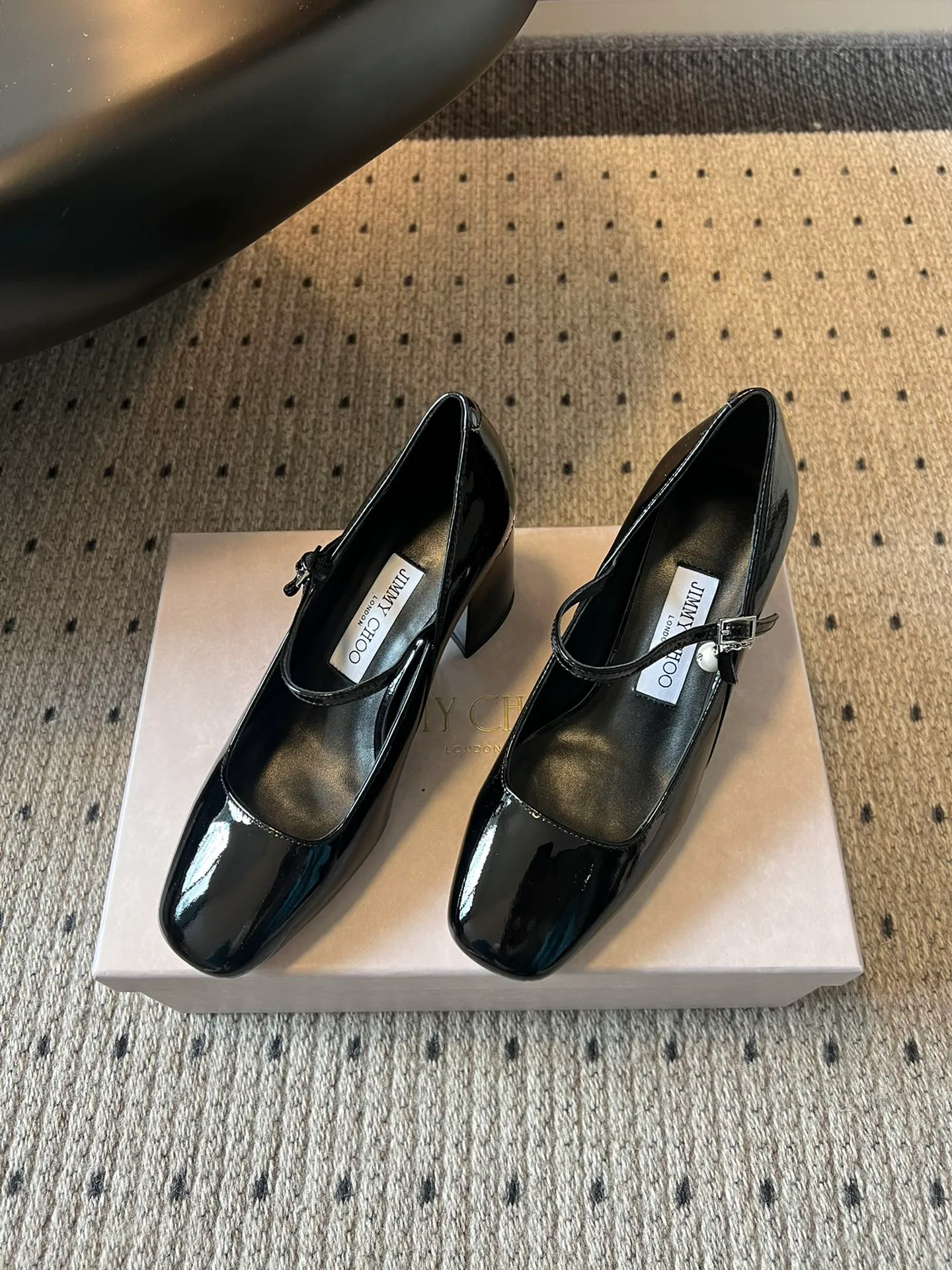 Материалы: верх — лаковая кожа; подкладка — натуральная овечья кожа; подошва — итальянская натуральная кожа. Особенности: квадратный нос, ремешок с прямой пряжкой и жемчужный акцент.