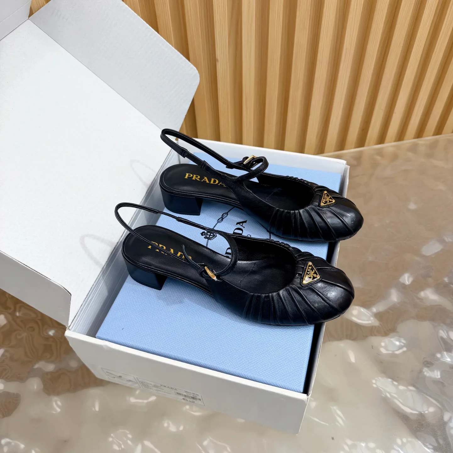 Туфли женские PRADA — классическая модель с треугольным логотипом на задней части, выполненная в ретро-стиле с элементами дизайна балеток и Мэри Джейн. Модель отличается открытой пяткой, устойчивым каблуком и фактурной кожаной поверхностью. Обувь изготовлена из качественной телячьей кожи, с подкладкой из овчины и кожаной подошвой. Каблук имеет высоту 4 сантиметра.