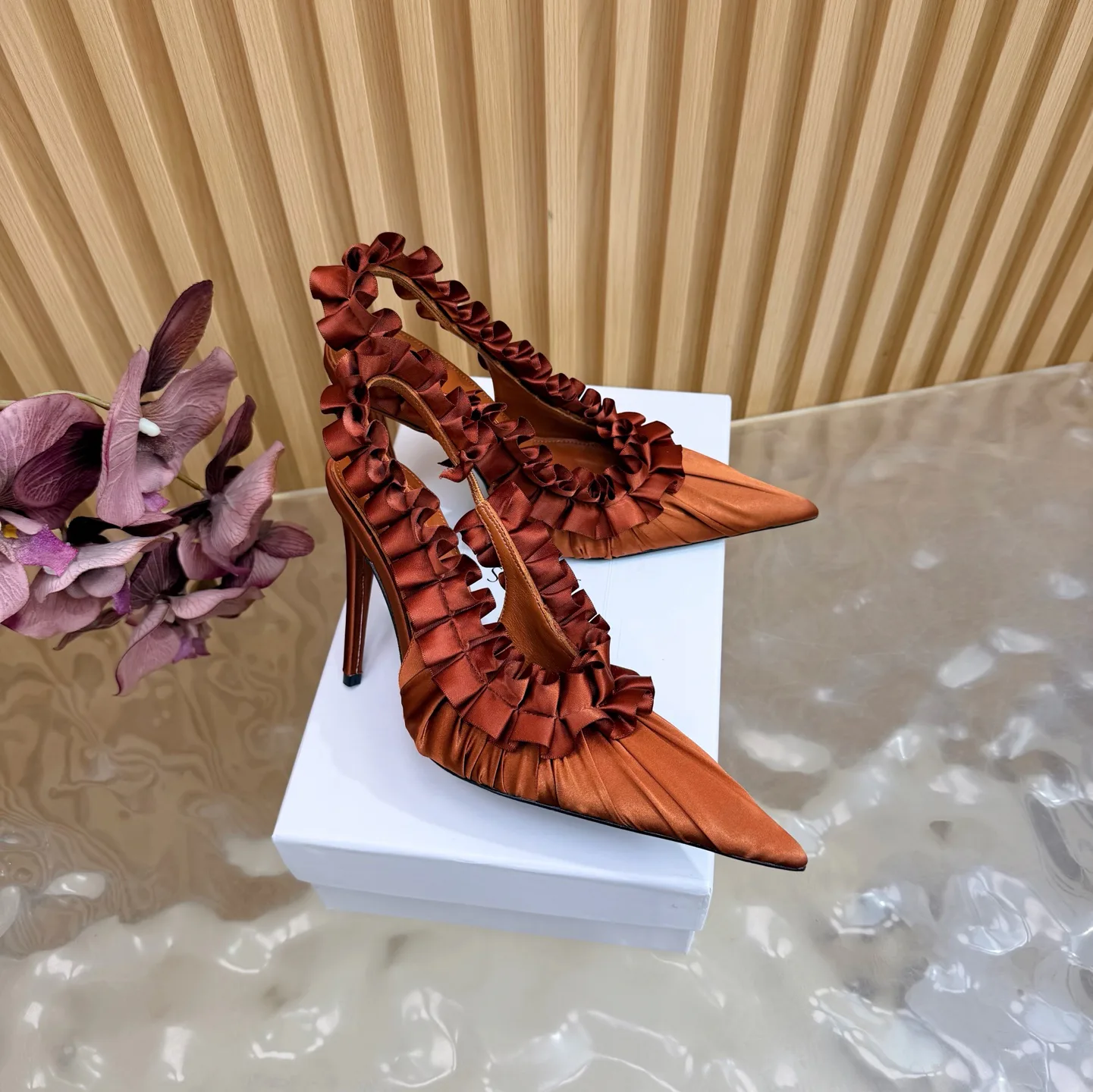 Туфли женские SAINT LAURENT — модель с острым носом из шёлка, украшенная декоративной металлической цепочкой. Высота каблука составляет 10.5 сантиметров. Подошва выполнена из натуральной кожи. Модель представлена в размерном ряде от 35 до 42.