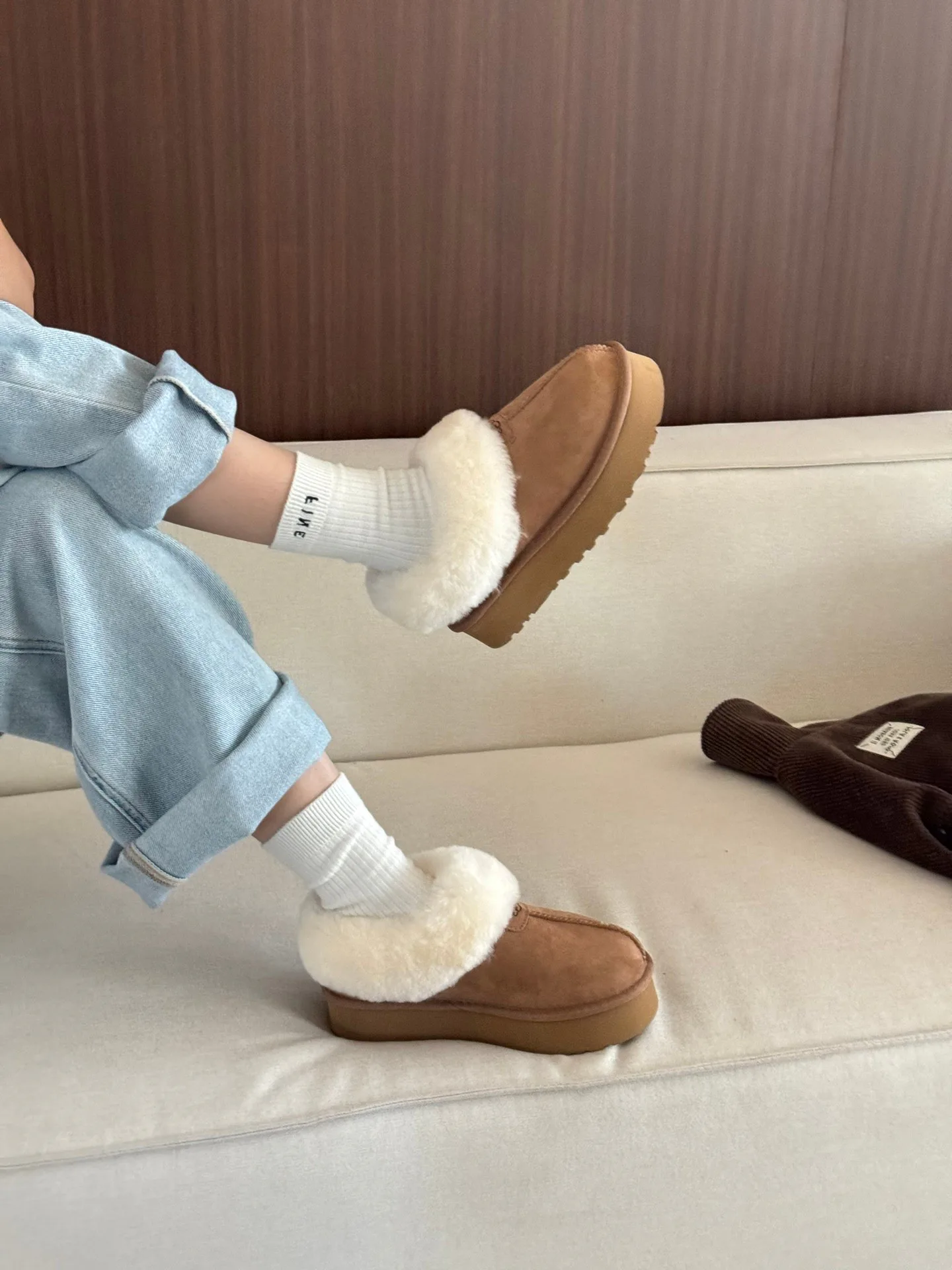 Женские зимние сапоги на толстой подошве. Подойдут для повседневного образа осенью и зимой. Выполнены в минималистичном дизайне, который подчёркивает практичность и элегантность. Верх и внутренняя отделка выполнены из овчины с объединённым кожаным и меховым слоем, что обеспечивает тепло и комфорт. Цвета Chestnut и Antelope Brown. Размеры EU 35–40. Толщина подошвы 3 см добавляет высоту и амортизацию на снегу. Назначение: подходят для повседневной носки в осенне‑зимний период; сочетаются с зимним пальто, пуховиками и джинсами.