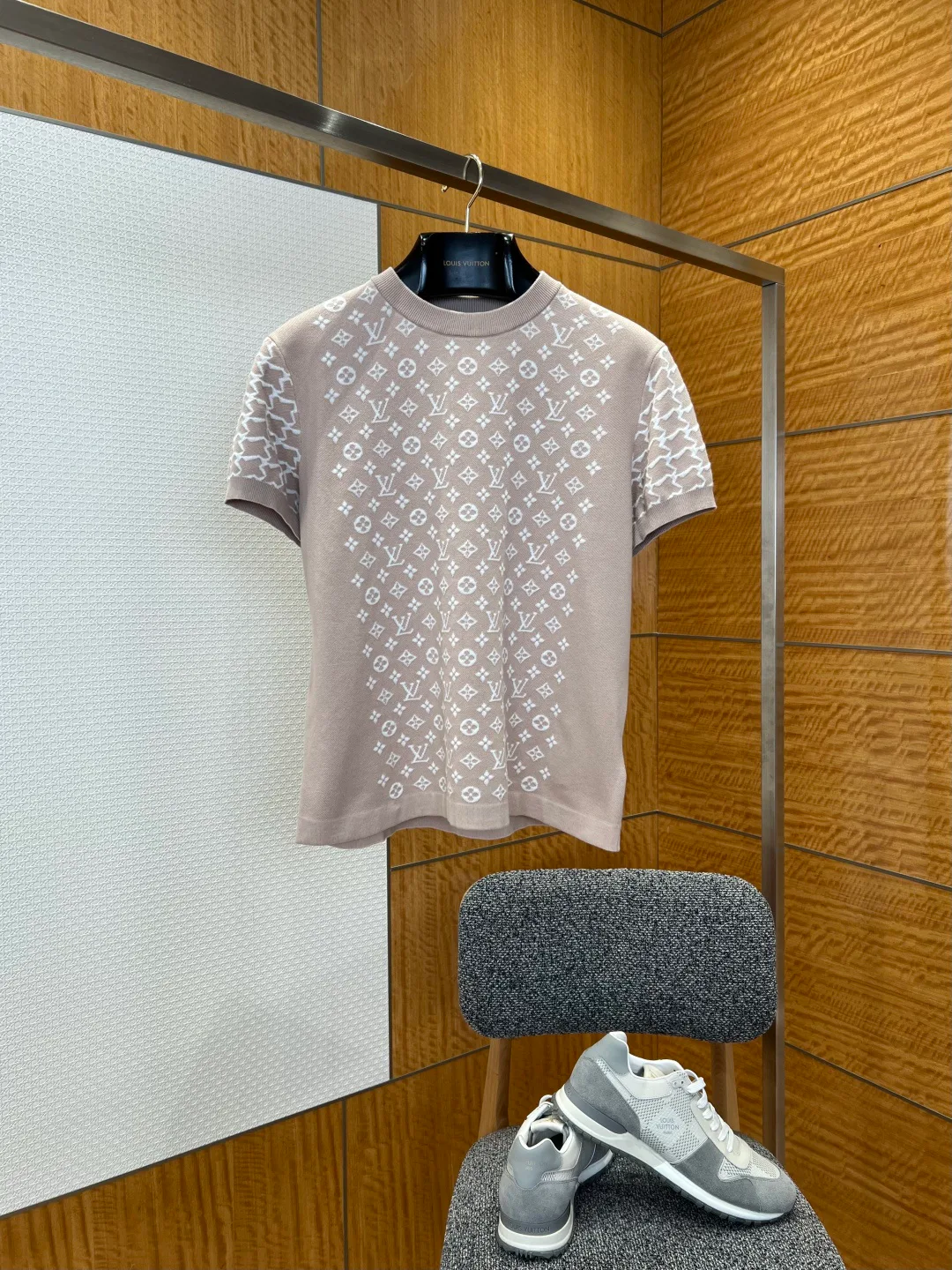 Футболка мужская LOUIS VUITTON — модель из тонкой трикотажной ткани с полным жаккардовым узором. Материал на основе шерсти обладает эластичностью, воздухопроницаемостью и мягкой текстурой. Классический круглый вырез и короткие рукава с аккуратной отделкой обеспечивают комфортную посадку. Узор сочетает фирменный мотив с геометрическими элементами, создавая выразительный объёмный эффект. Свободный крой подходит для различных ситуаций, а укреплённые швы повышают износостойкость вещи.