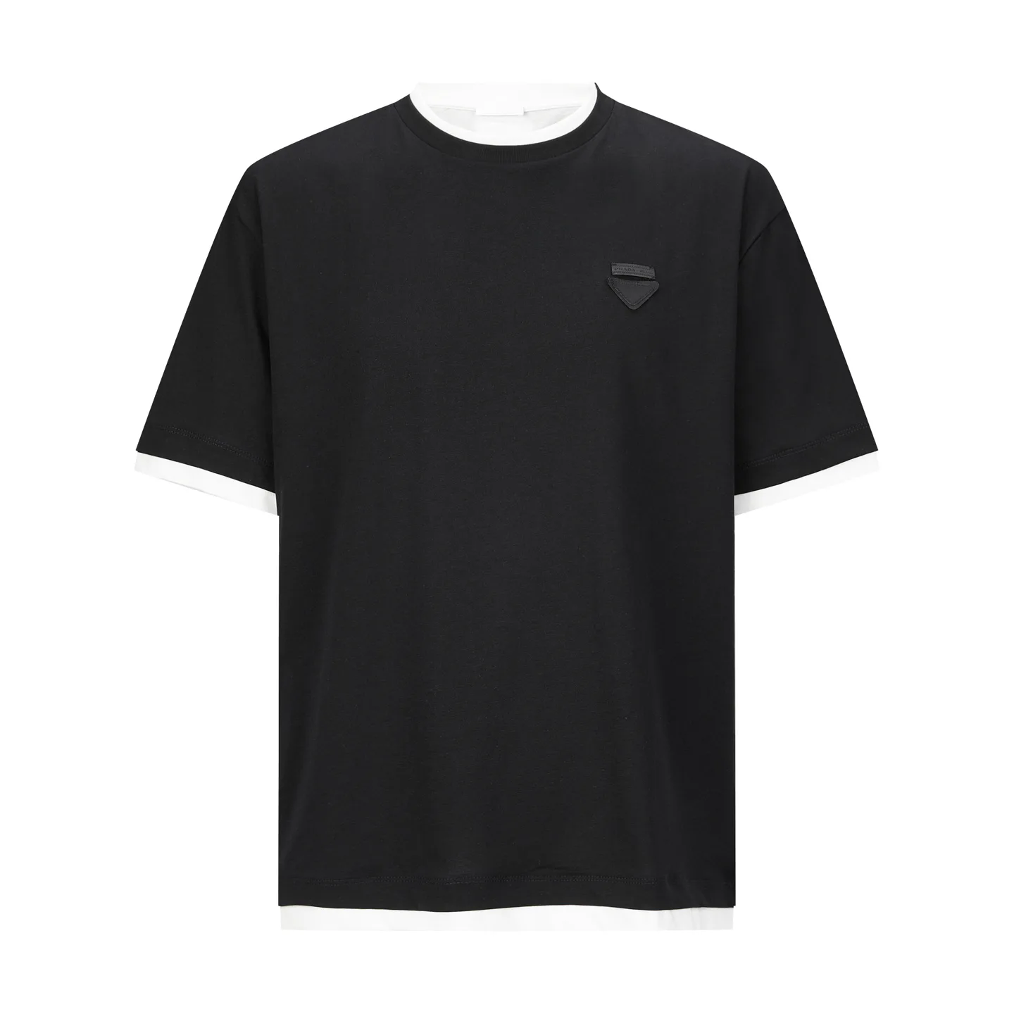 Футболка мужская PRADA — модель из хлопка с современным кроем, создающая эффект наслоения и контраста. Она подходит для повседневных образов, добавляя им динамики. В производстве использована ткань на основе 50-х двойных скрученных нитей с добавлением сораны, а также двойная строчка и лазерная обработка фирменного тканого ярлыка. Силуэт включает длинные рукава и прямой подол.