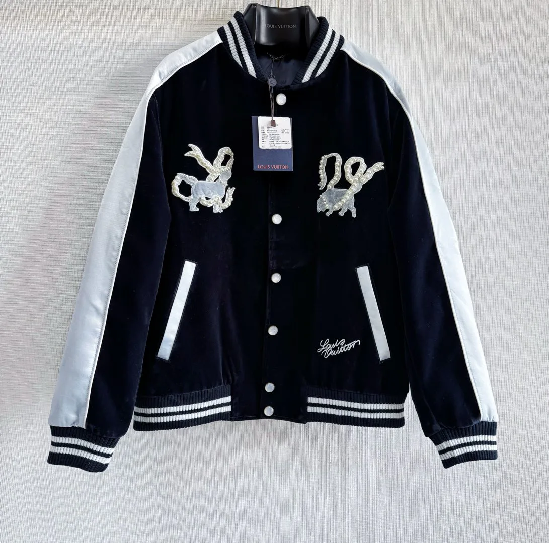 Куртка мужская LOUIS VUITTON — из однослойной бархатной ткани весом около 300 г/м², передняя часть украшена вышивкой, выполненной на японской машине Tajima. Швы соединения выполнены из сатина, бусины ручной крючковой техникой закреплены, каждая бусина надёжно фиксируется на полотне, что обеспечивает аккуратность посадки элементов и декоративный эффект. Застежка — жемчужные пуговицы; комплект фурнитуры полностью поставляется. Размеры 46, 48, 50 и 52.
