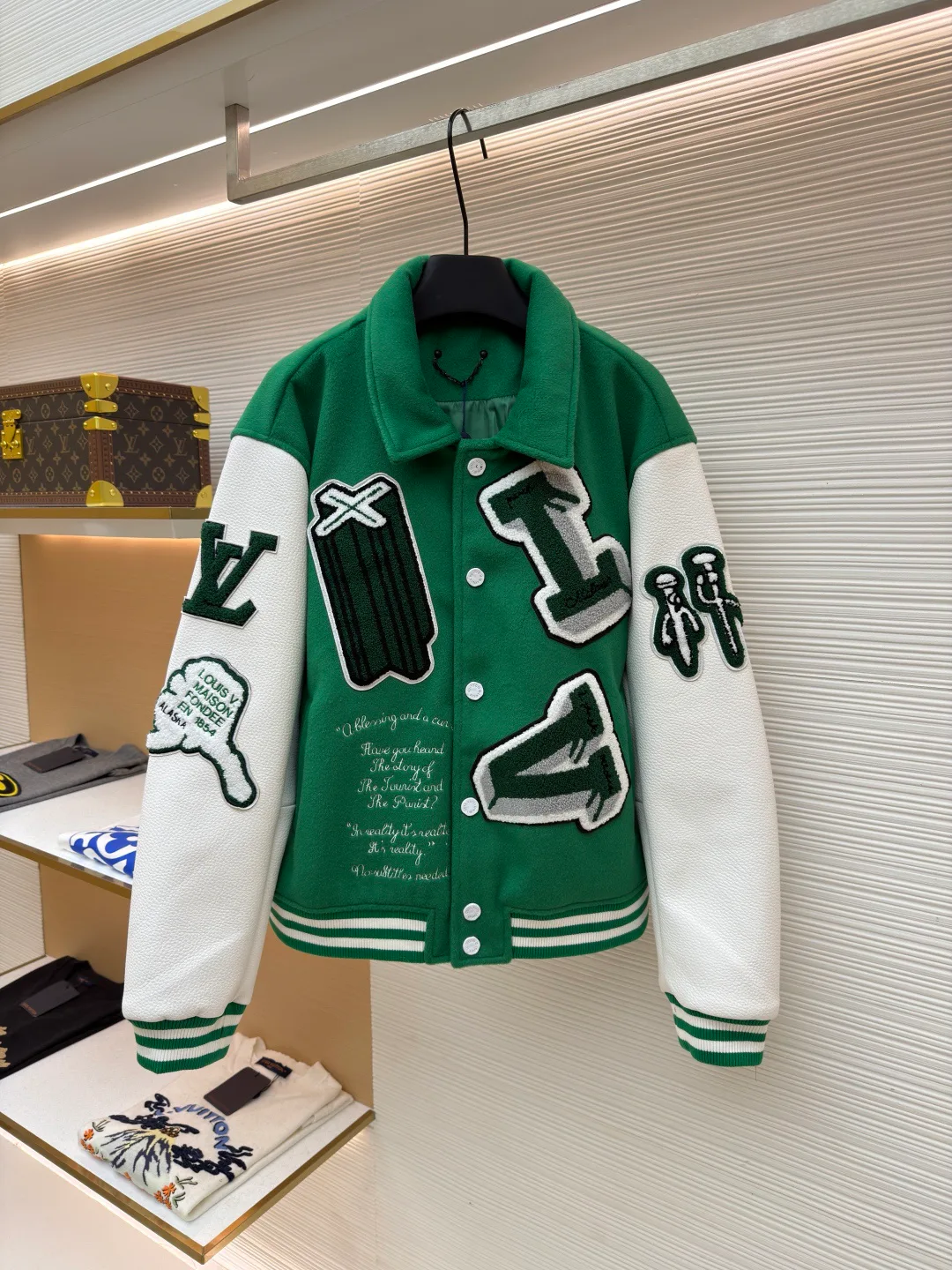 Куртка мужская LOUIS VUITTON — куртка с длинными рукавами в бейсбол-стиле, изготовленная из ткани на основе высокоплотной шерстяной смеси, обработанной пушистой и расчёской технологиями, что даёт бархатистую фактуру и сохраняет форму. На рукавах выполнены вставки из искусственной кожи с фактурой, напоминающей зернистость, с тиснением и мягкой обработкой поверхности, что обеспечивает прочность и износостойкость. На корпусе буквы и рисунки выполнены сочетанием махровой вышивки и аппликаций; нити дают объём, края аппликаций обработаны оверлоком и подшиты; рукописные надписи выполнены гладевой вышивкой, стежки мелкие, шрифт чёткий. Планка застёгивается на пуговицы из жемчужно-раковины, вручную отполированы; воротник и нижний край выполнены из ткани с добавлением эластана, что обеспечивает эластичность и сохранение формы. Куртка имеет приталенный крой; доступны размеры 46–48–50–52; ткань мягкая и однородная по цвету; полный комплект фирменных ярлыков.