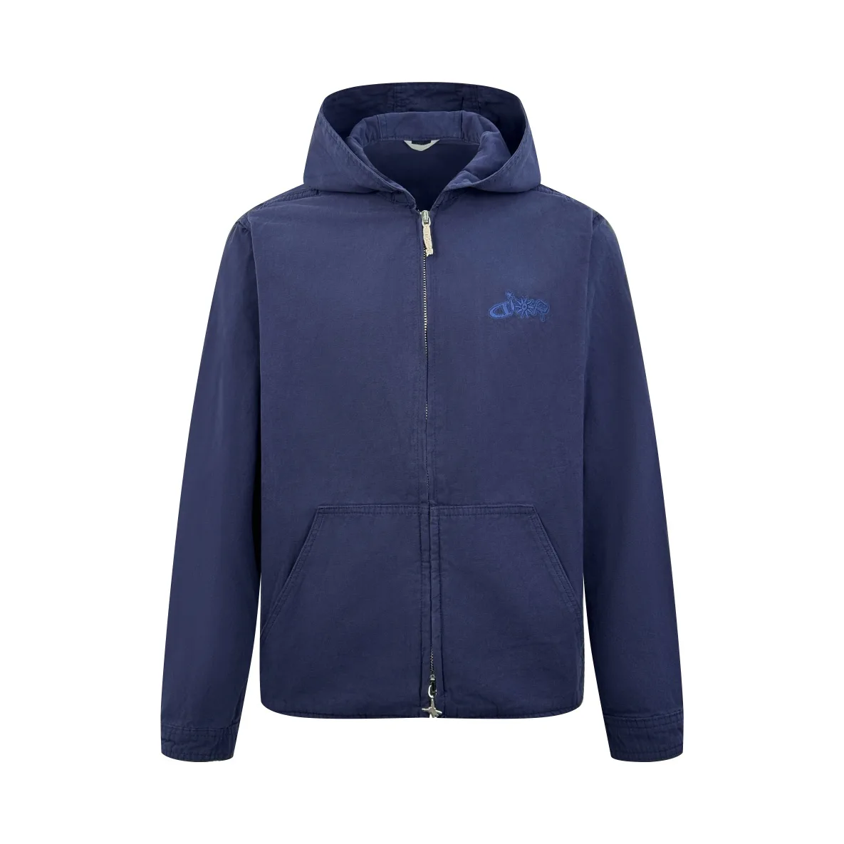 Дизайн и детали. Цветовая история строится вокруг серо-голубой палитры, подчеркивающей эстетику скорости и технологичности. На груди вышивка той же гаммы, скрывающая пароль коллаборации и создающая микрокорреляцию с фоном куртки. Вышивка служит движущейся эмблемой бренда, превращая текст в стильный элемент дизайна. Капюшон подчеркивает детализацию и качество исполнения. Молния по всей длине куртки обеспечивает практичность и комфорт.