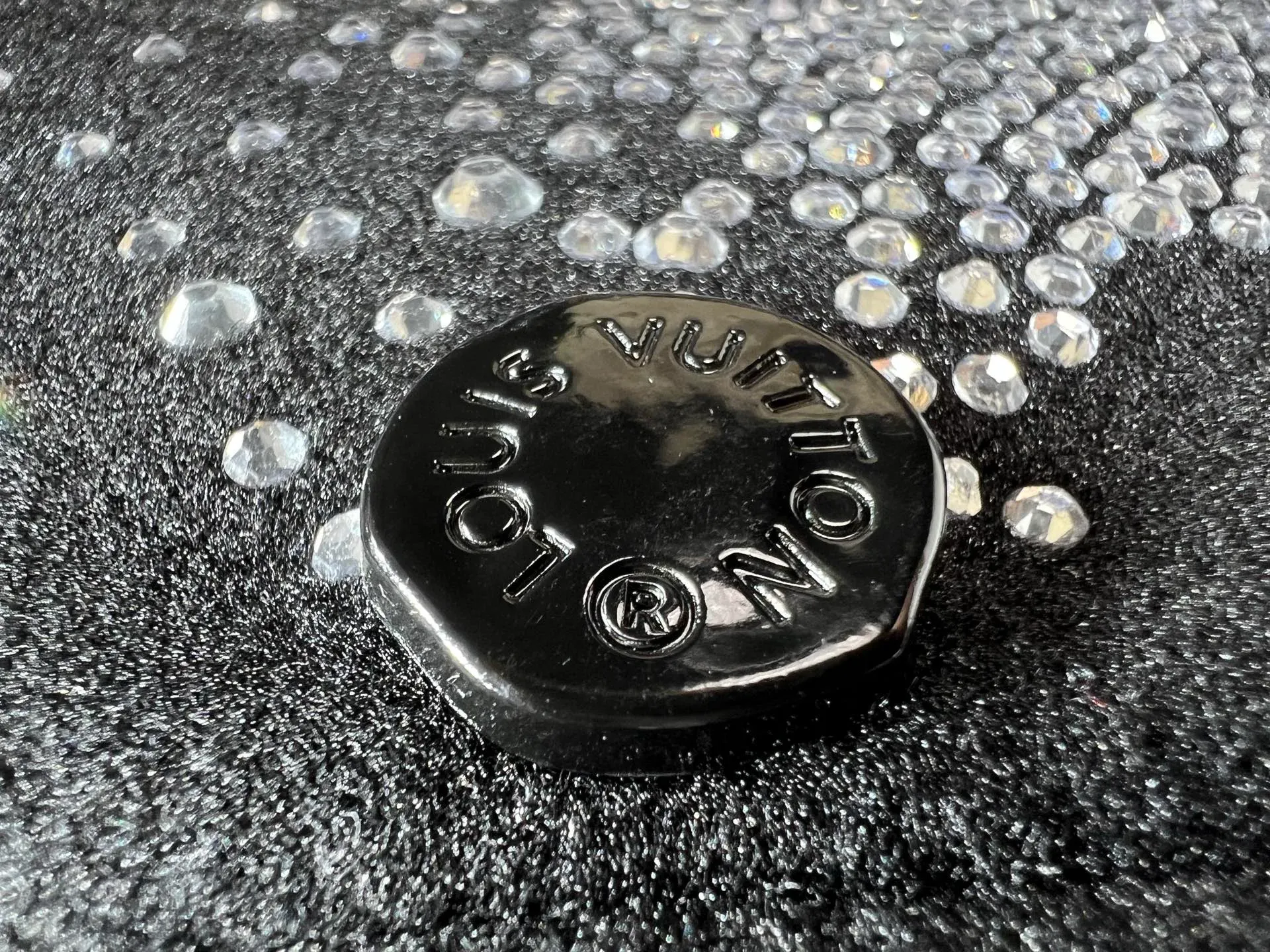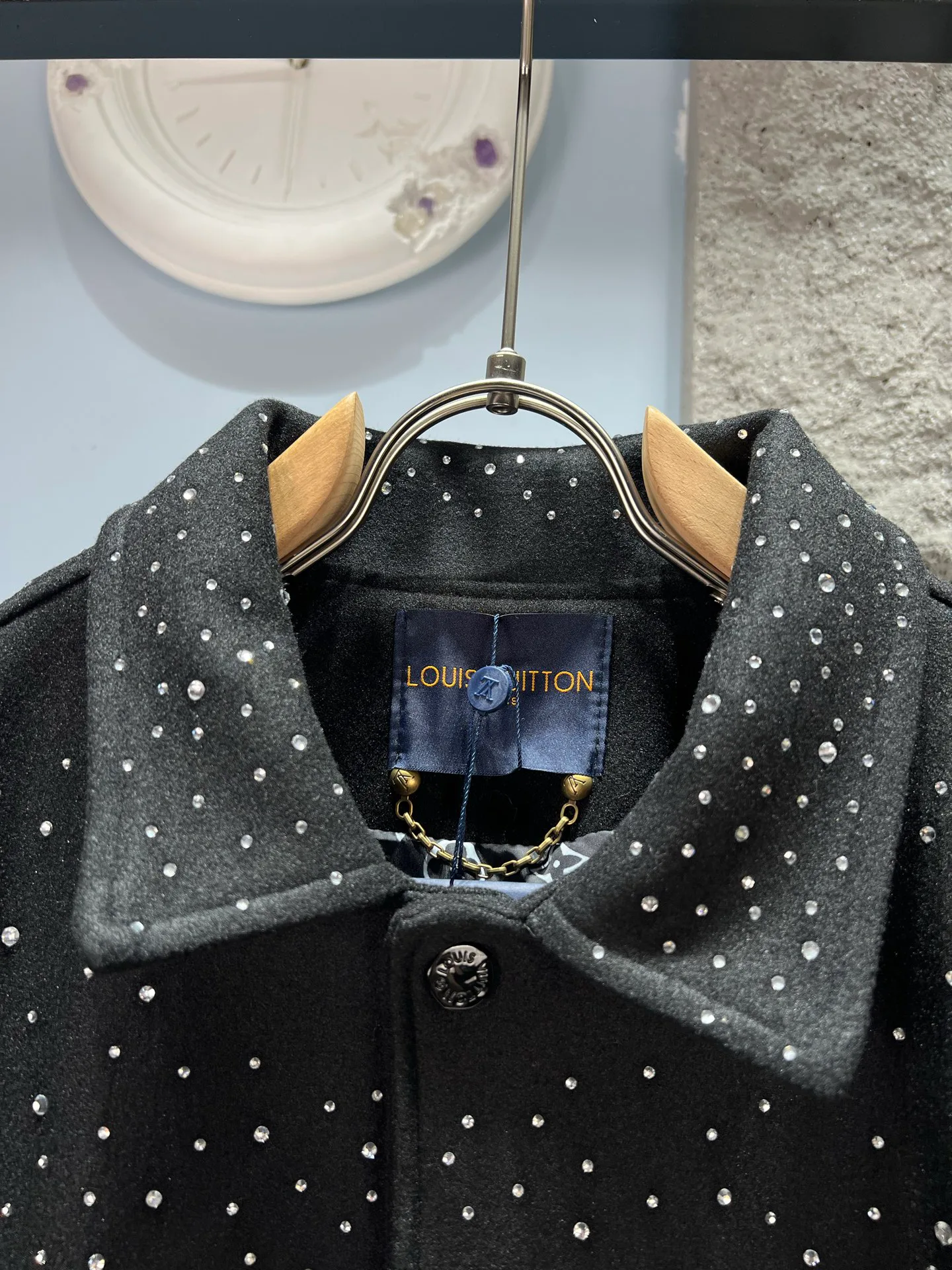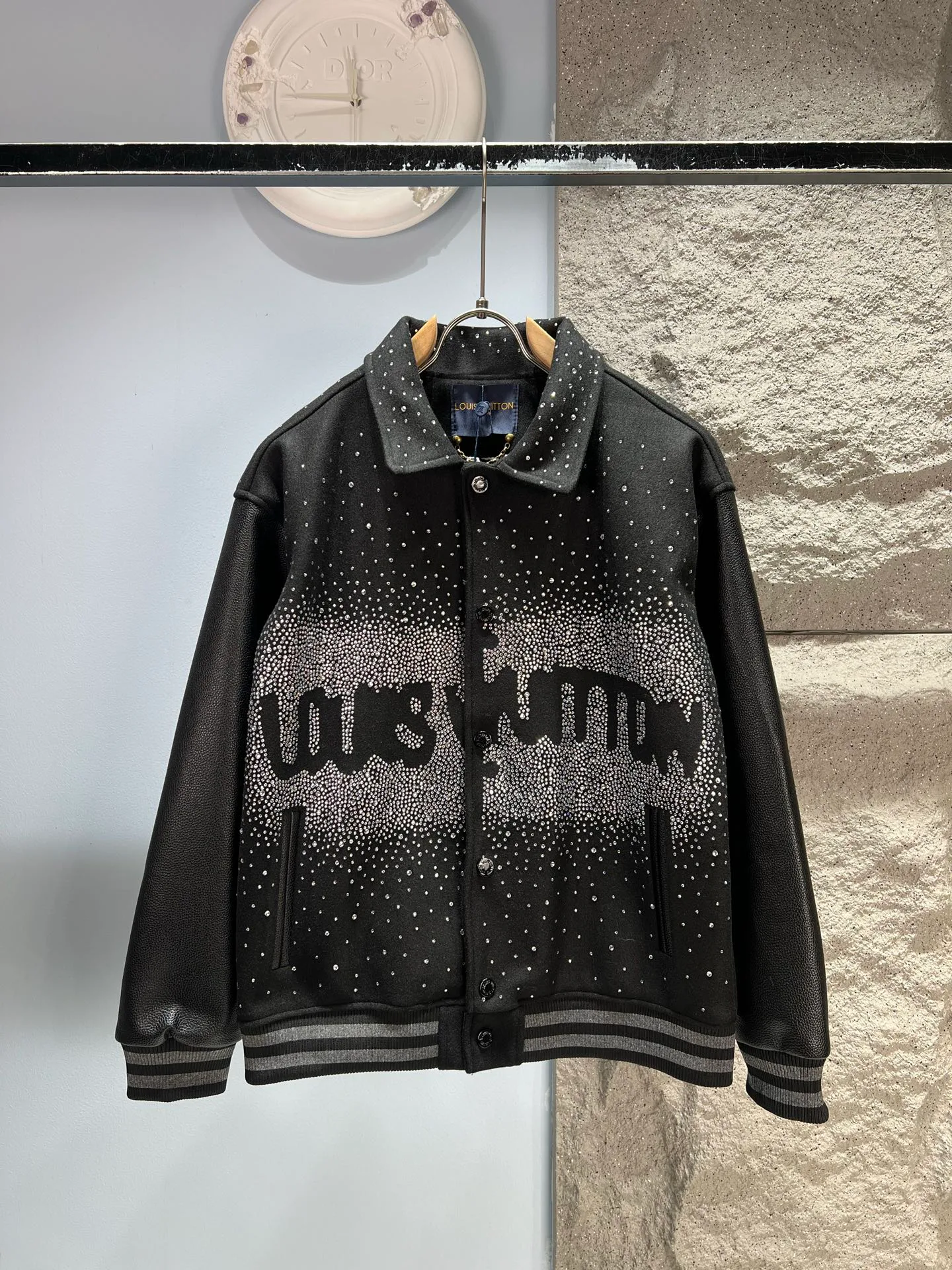 Дизайн и детали: грудь полностью украшена стразами; сочетание страз и вырезанного логотипа создает эффект полупрозрачного знака. На спине расположен слоган коллекции LV. Воротник классический отложной. Манжеты и низ куртки — резинки, обеспечивающие посадку. Расположение кожаных панелей задаёт характер изделия.