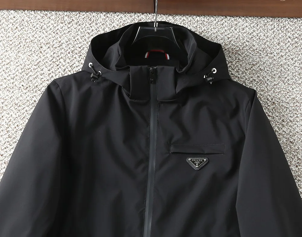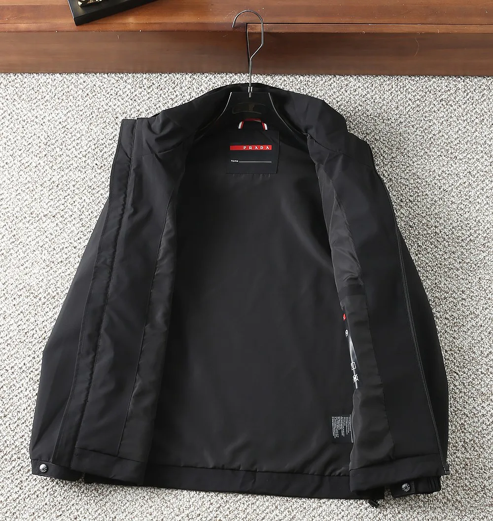 На левом рукаве вышивка с логотипом Prada. Прочные молнии и фурнитура, изготовленные на заказ, добавляют нотки уникальности. Аккуратные строчки и отделка подчёркивают качество исполнения.