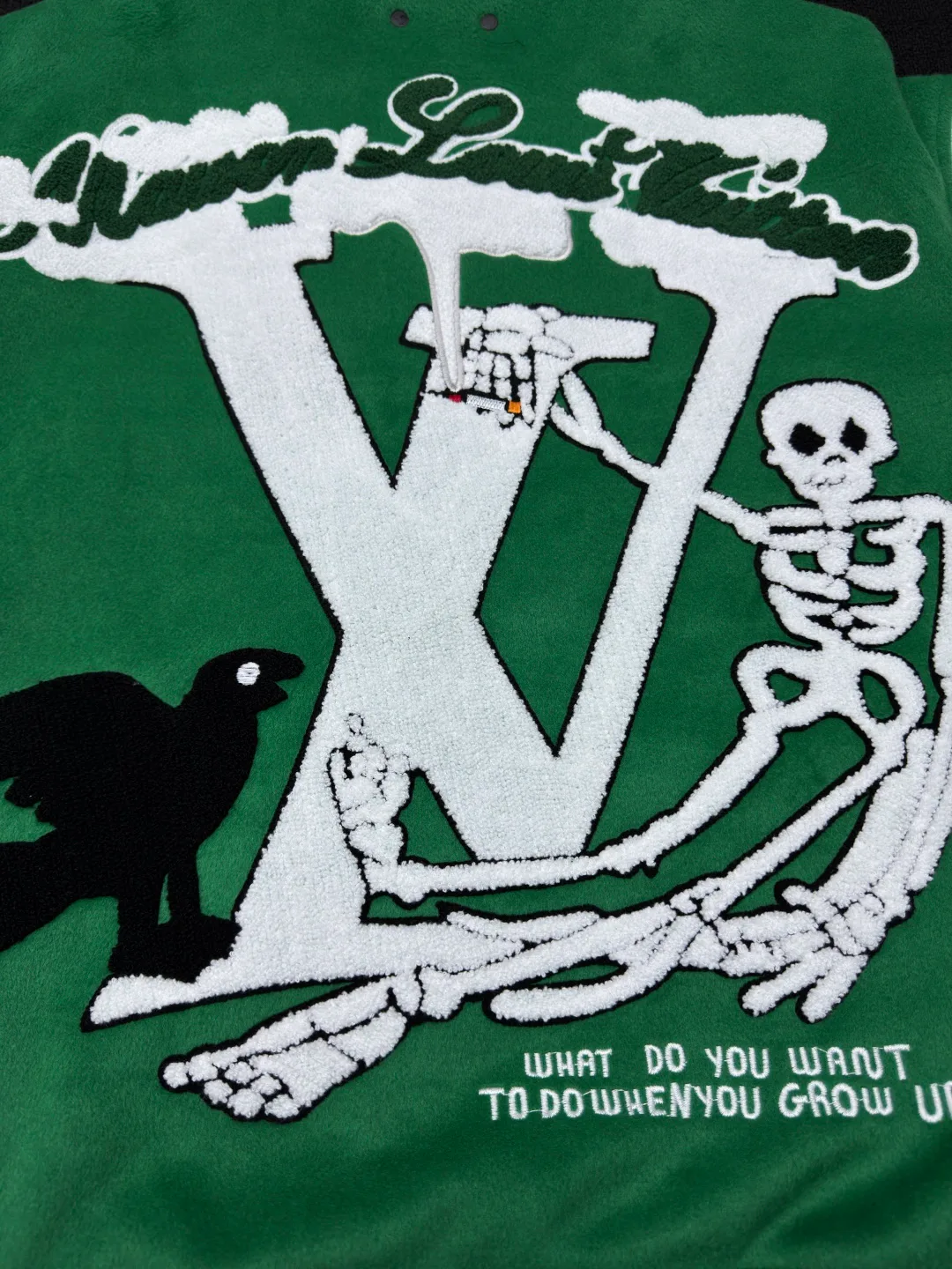 Особенность дизайна — крупное 3D-изображение черепа на спине, выполненное с высокой детализацией и объемом.