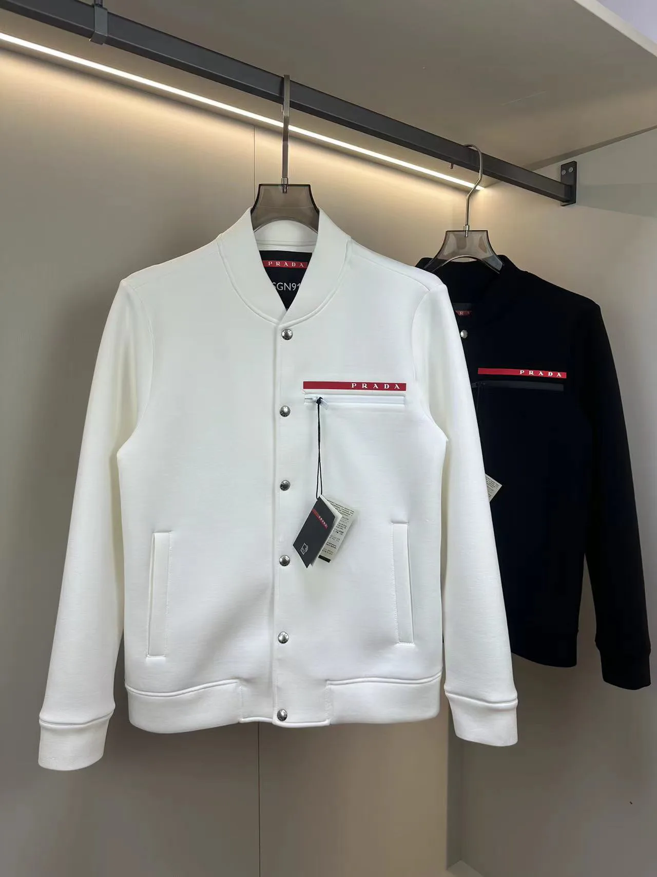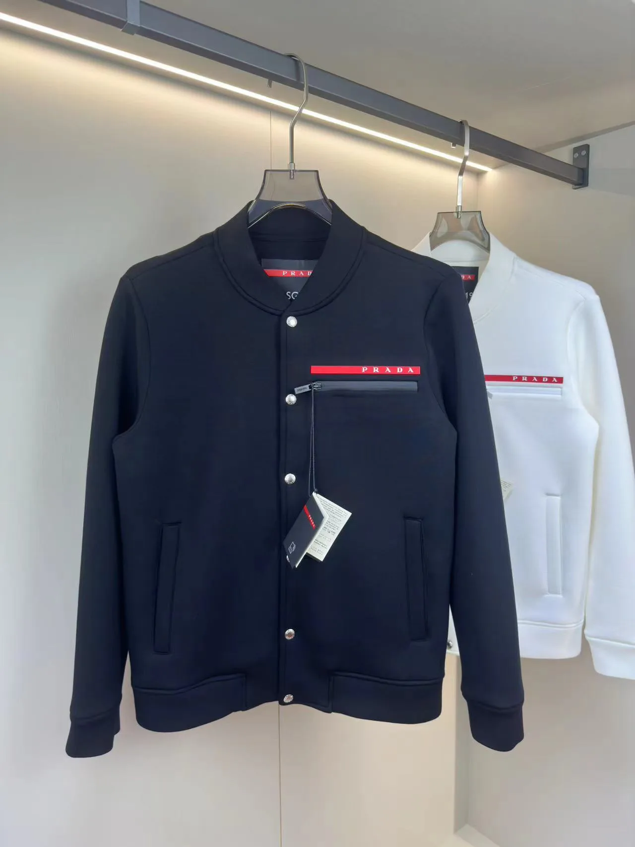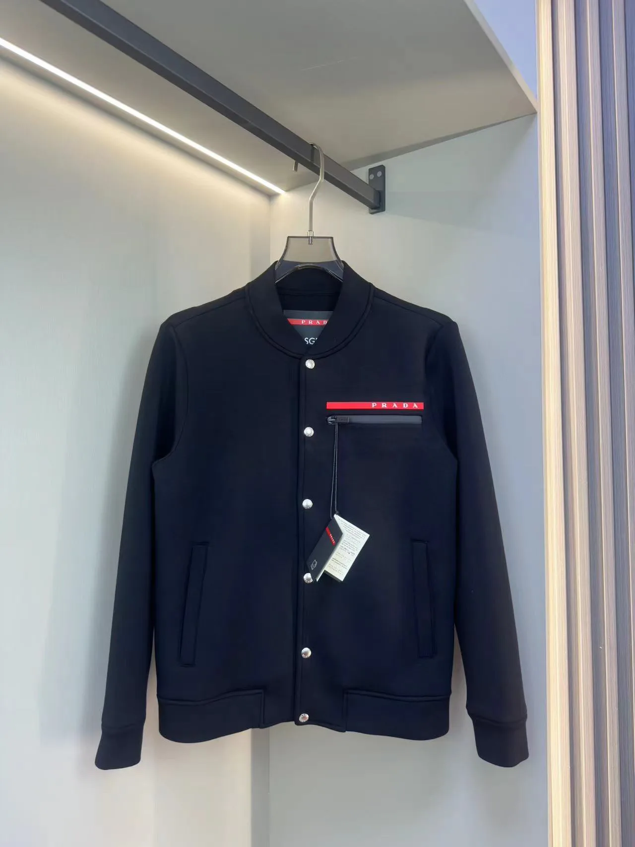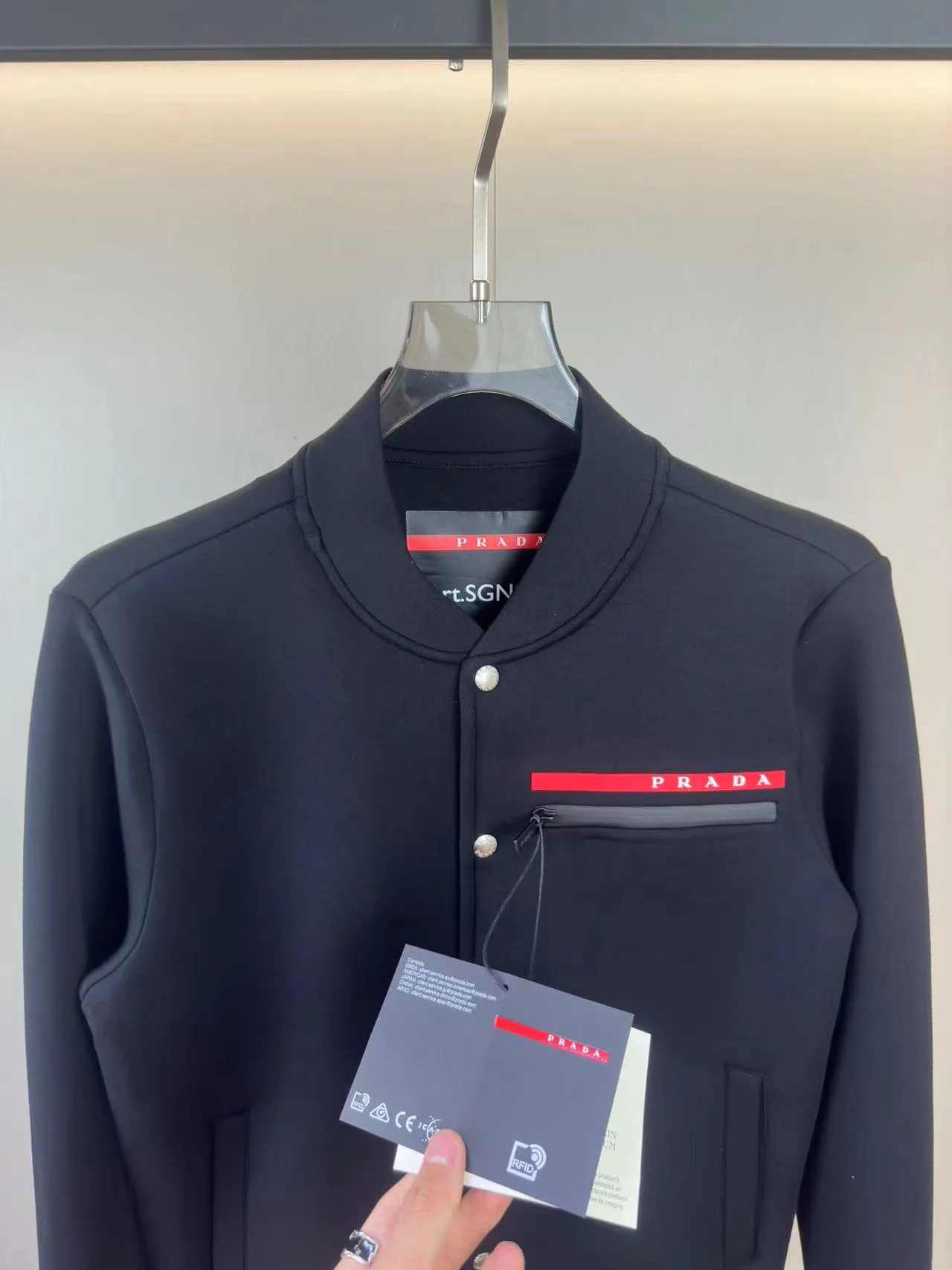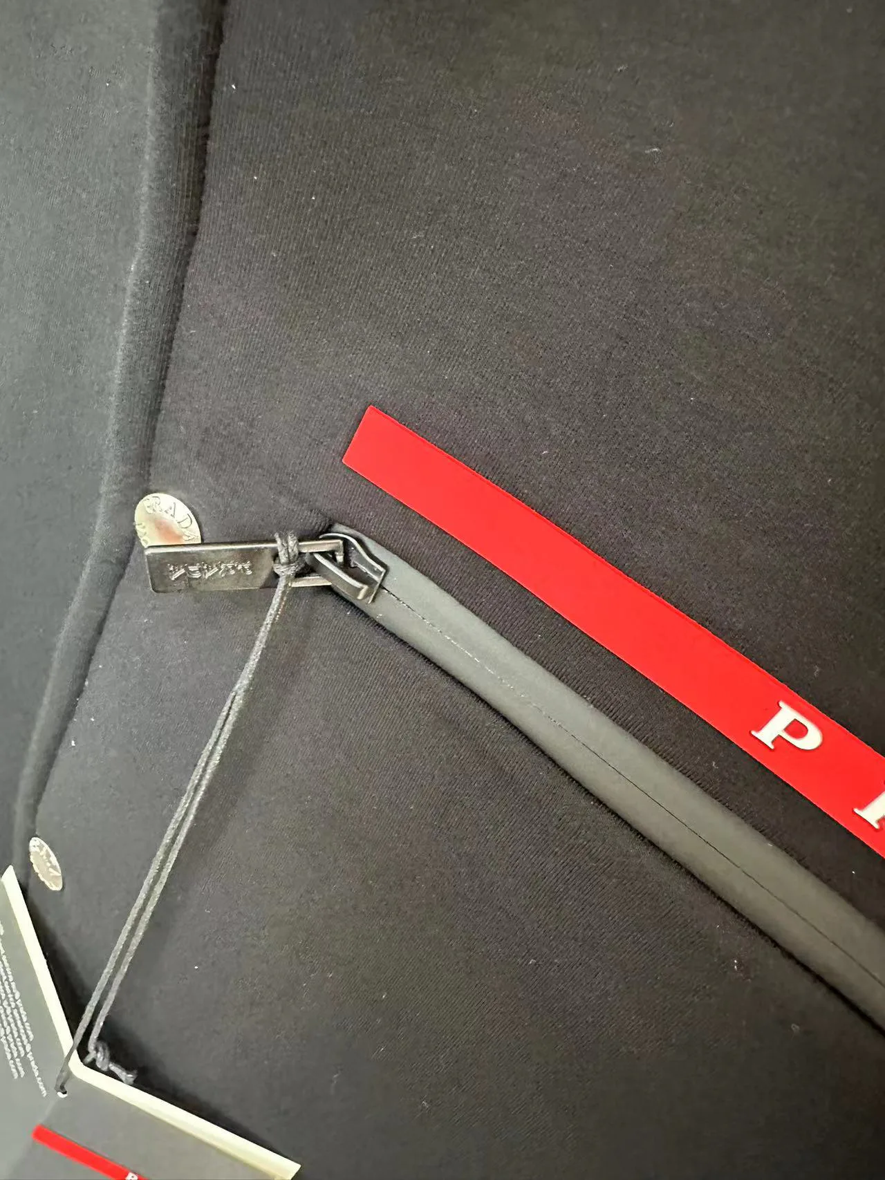 Фурнитура с фирменным Prada-гальваническим покрытием; металлические застежки соответствуют фирменному стилю. Молния имеет водозащитную защиту бренда TAT. На груди красный латексный нашивочный логотип Prada Linea Rossa — заметная деталь, подчёркивающая фирменный стиль.