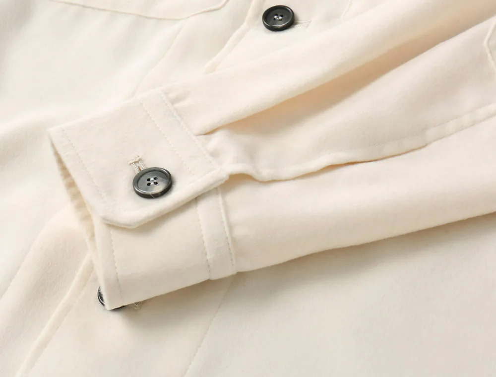 Дизайн в ретро-эстетике сочетается с современным урбанизмом. Воротник, манжеты и край продуманы до мелочей: аккуратно подобранные пуговицы, ровные строчки и отделка. Детали фурнитуры и шва подчеркивают качество.