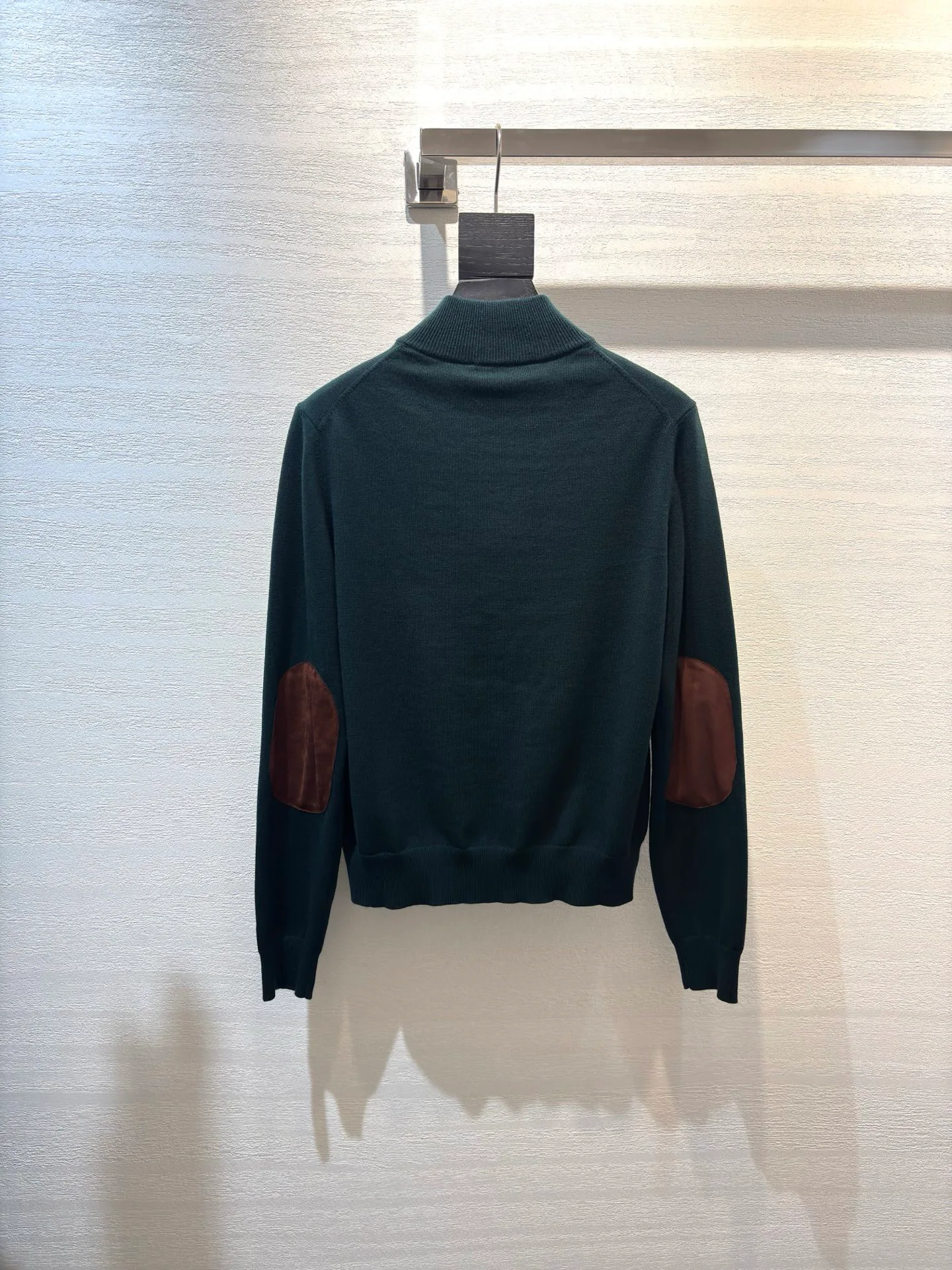 Материалы: пряжа из смеси кашемира и шерсти, поверхность деликатная и мягкая. Дизайн воротника: полу‑высокий воротник в сочетании с застёжкой на молнии. Посадка: свободный, но не мешковатый крой. Детали: небольшой логотип на груди; локти с вставками из замши. Размеры: S, M, L. Стиль: сдержанная роскошь и элегантная небрежность, подходящая для повседневной носки и многослойности.