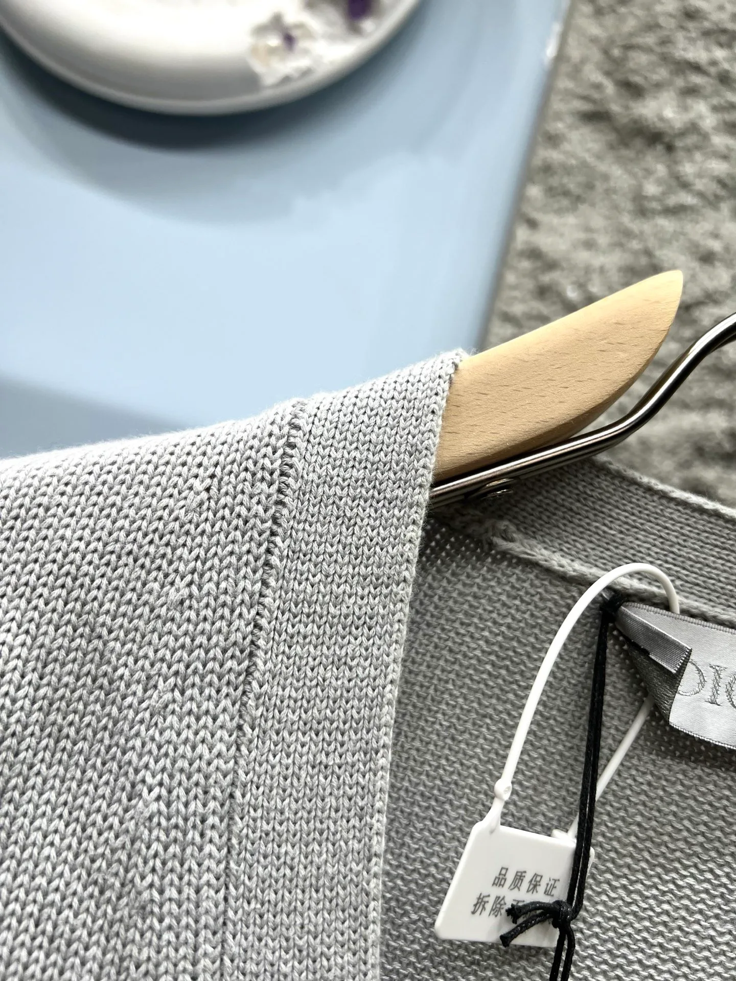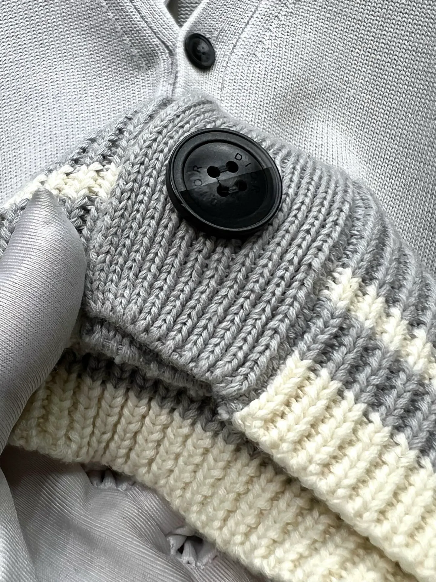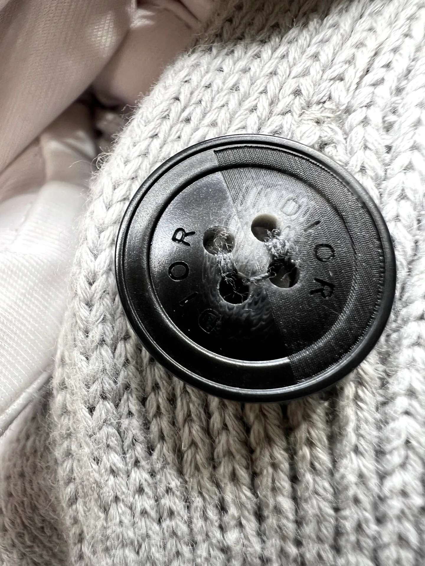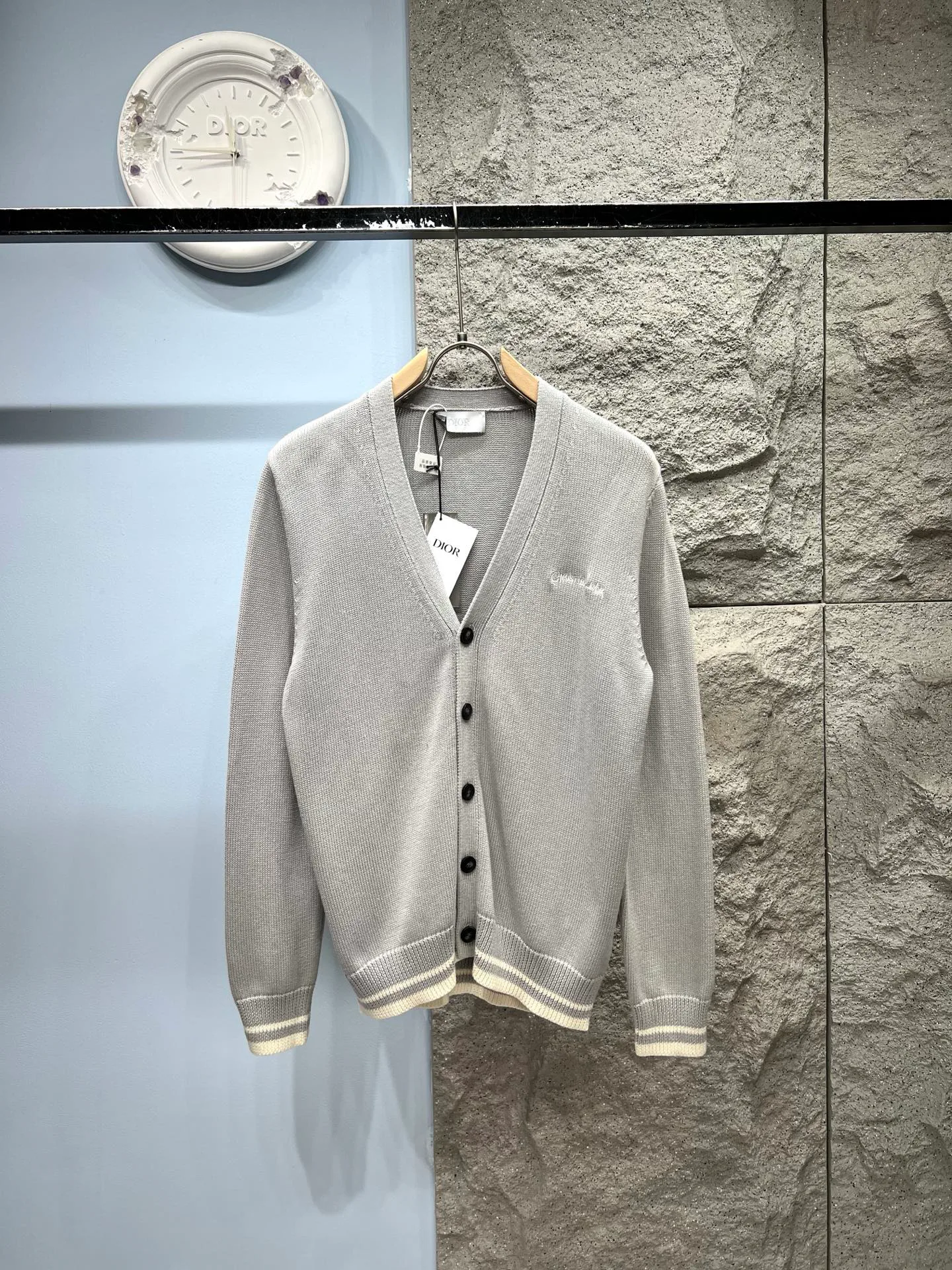 Дизайн: узорный кардиган с V‑образным вырезом. Вышивка на груди — Christian Dior, объемная. Акценты: манжеты и нижний край в полосках. Силуэт лаконичный, благородный и элегантный; подходит для повседневной и формальной носки.