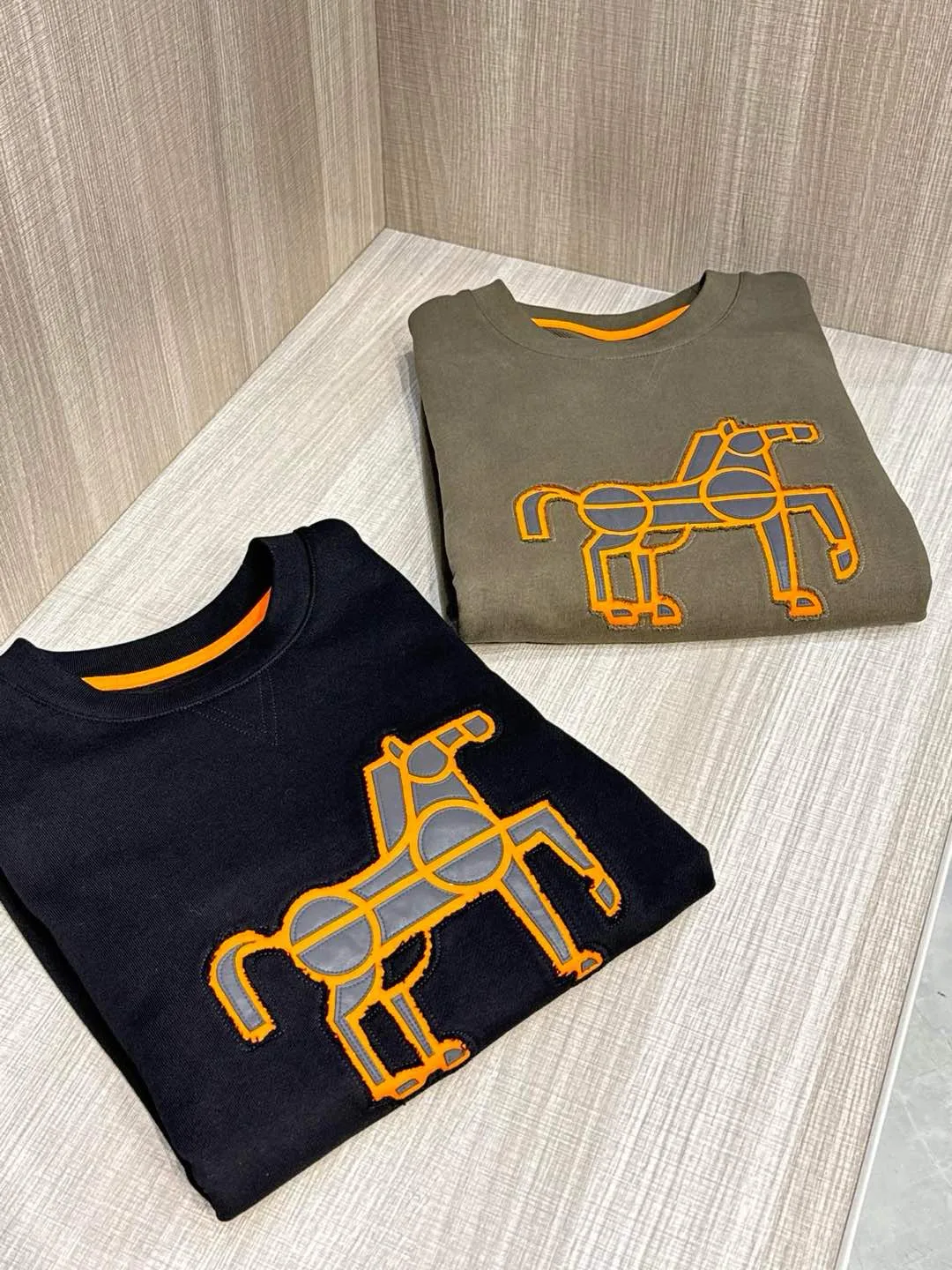 Свитшоты мужские HERMES — свитшет с круглым воротом и кожаной нашивкой с изображением коня на груди.